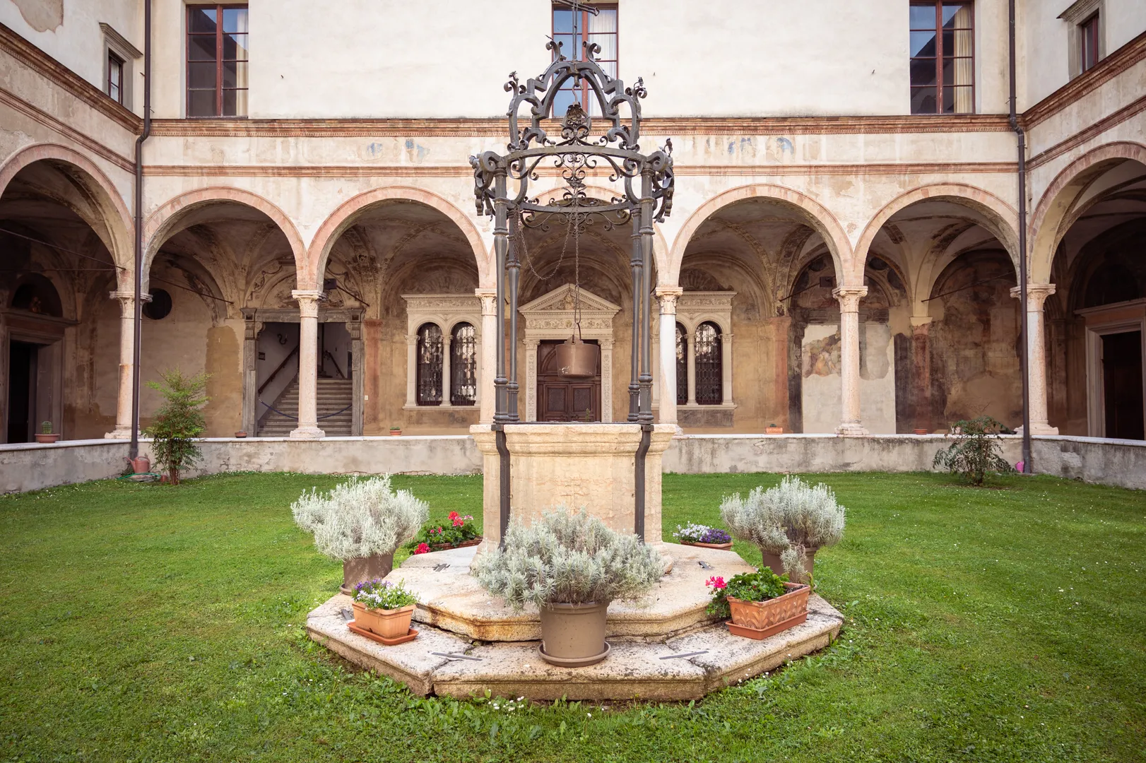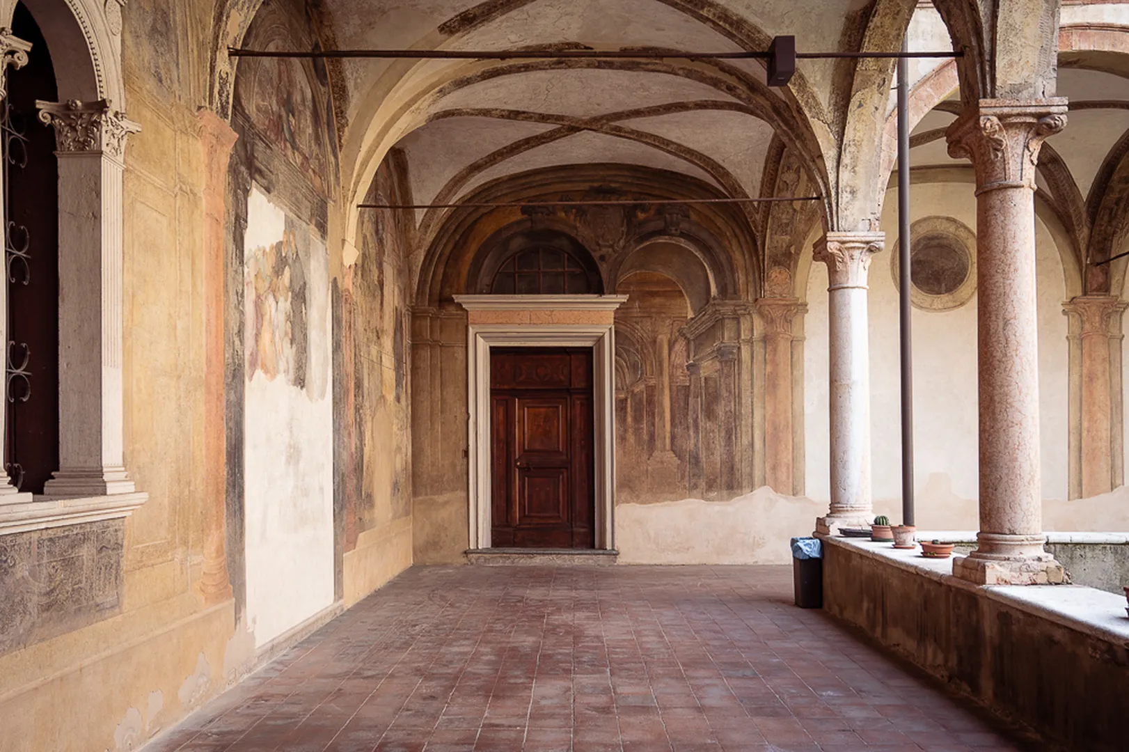 La mano del Correggio, per la decorazione degli interni, fu assicurata grazie all’acuto intervento dell’abate Girolamo Spinola, che commissionò all’artista cinque affreschi e molti fregi. Il monastero ruota attorno a tre chiostri: per primo si incontra quello di San Giovanni, o della Porta, circondato dal colonnato a colonne ioniche, segue il chiostro del Capitolo decorato dal Correggio, infine quello dedicato a San Benedetto, il più grande, abbellito dai tondini con le raffigurazioni dei santi, purtroppo rovinati dalle intemperie.