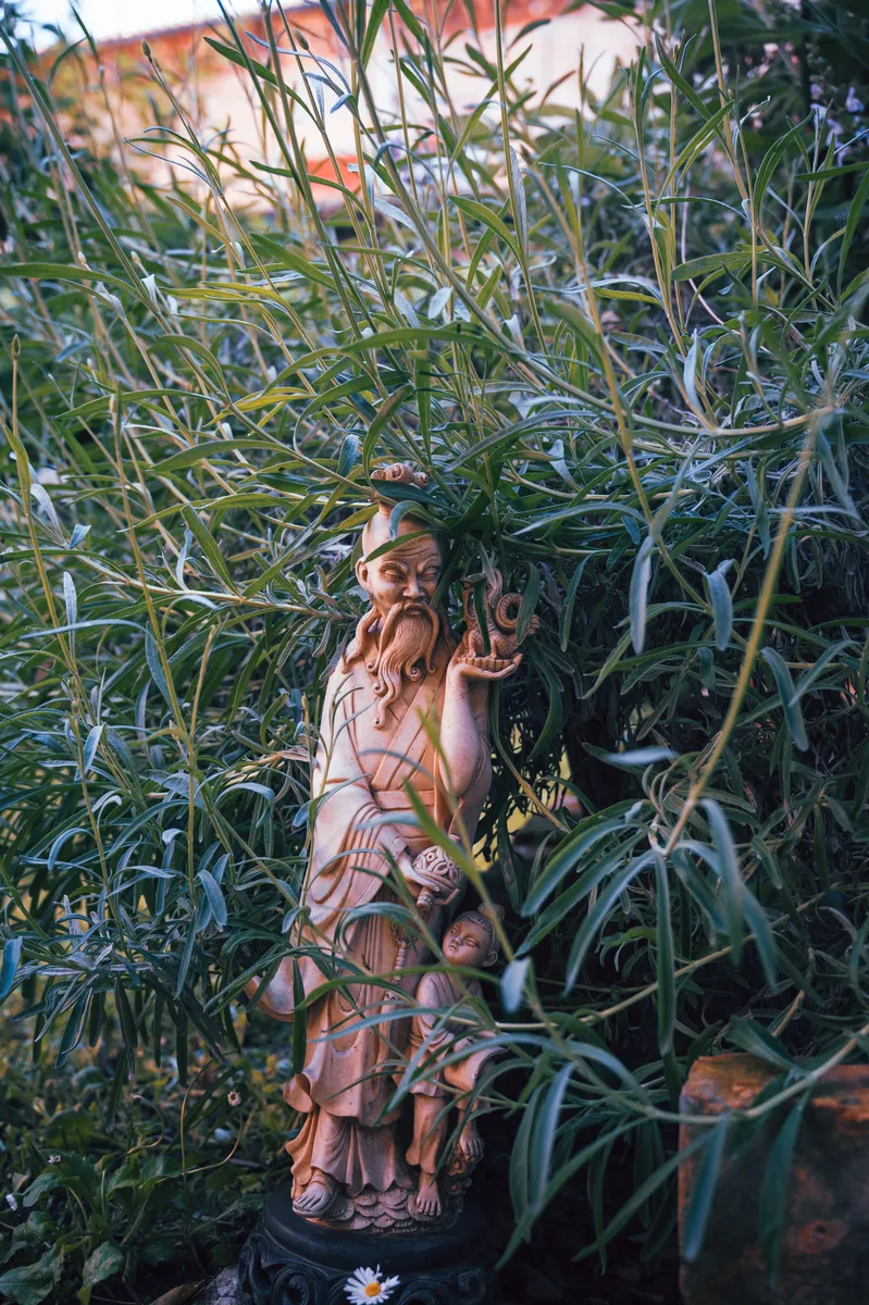 Altri reperti e oggetti dislocati qua e là sono recenti: a loro si può attribuire un nome, un momento, un motivo. C’è l’insegna del cinema Jolly di Villanova, recuperata dal proprietario di casa, appassionato cinefilo. C’è l’abete piantato da suo figlio Giacomo, quando era bambino e aveva solo undici anni. C’è la lavagna dove ogni giorno Giacomo, oggi adulto, scrive una poesia per salutare e sorprendere la sua compagna Chiara. Ci sono le ceramiche realizzata da Chiara e il forno che le ha regalato l’artista Sergio Zanni. Ci sono le tartarughe, tantissime, la più anziana ha trentacinque anni, e c’è anche il loro guardino, incarnato nella statua di Lao Tsu. Ci sono i cactus e le succulente, l’edgenworthia profumatissima quando fiorisce, la palma giovane ma cresciuta in fretta.