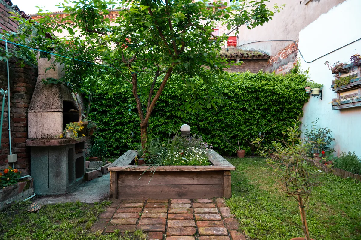 Il palazzo che custodisce questo esuberante spazio verde è molto antico, probabilmente le fondamenta risalgono al 1200, e come tutto ciò che ha una lunga storia conserva misteri e leggende. Una di queste vorrebbe che Napoleone, passando da Ferrara, si sia fermato proprio qui per far abbeverare i cavalli, sfruttando l’acqua del vecchio pozzo che tuttora si trova in cantina. Lo stesso pozzo suggerisce che in questa casa possa aver abitato in passato un pittore: nel suo fondo sono stati trovati dei cocci con delle prove colore. Ma quando? Ma chi? Non è dato sapere! Un altro enigma è rappresentato dalla lapide, utilizzata come bordo dello stagno artificiale: è stata ritrovata in giardino, non si sa da dove provenga.
