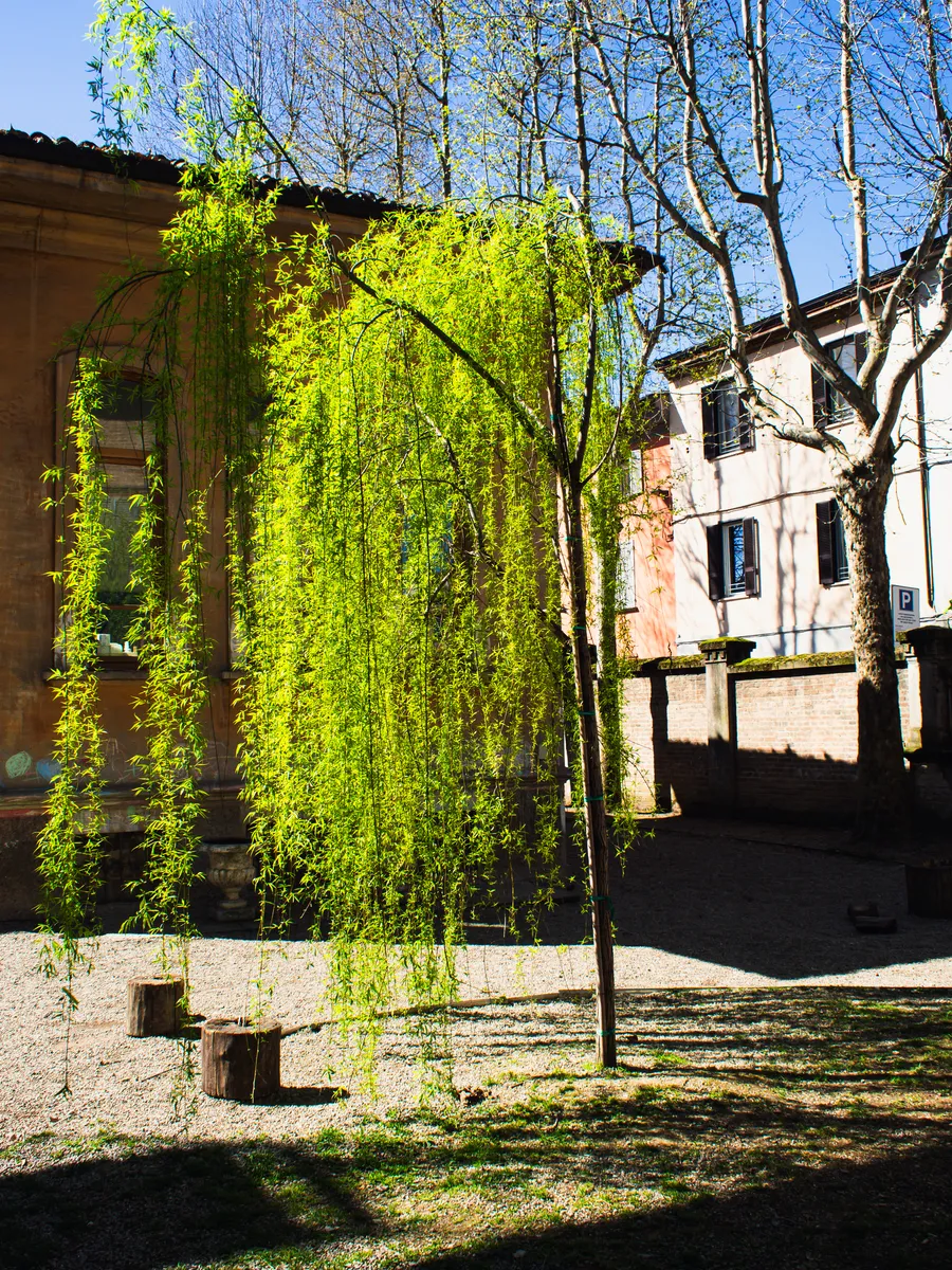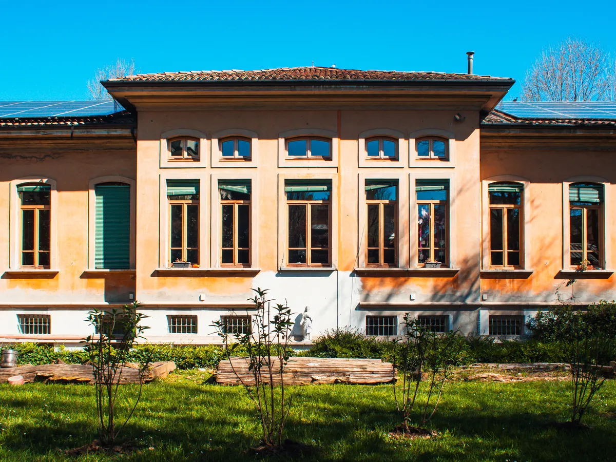 Oggi la struttura accoglie sia i piccolissimi del nido che i bambini della scuola d’infanzia, e soprattutto per questi ultimi – straripanti di energia, mobili e curiosi – il giardino ha un ruolo fondamentale: rappresenta un aula didattica a cielo aperto. Tra il salice e la magnolia, i cespugli di aucuba e la buddleia, le tane degli insetti e i nidi degli uccellini, qui si applica ciò che gli operatori del settore chiamano outdoor education. Ovvero? Si abituano le nuove generazioni a vivere con serenità e gioia l’ambiente naturale, a superare la paura di camminare su un tronco, a fronteggiare con fiducia le piccole difficoltà, a cadere e rialzarsi, senza avere paura di sporcarsi di terra i pantaloni. Qui si impara osservando: il ciclo delle stagioni, le abitudini dei piccoli animali che si nascondono sotto le foglie o passeggiano tra i fili d’erba, a cosa servono i fiori e i frutti, perché è importante che d’inverno faccia freddo. Il giardino in origine era più ampio, arrivava fino a via Campagna, è stato leggermente ridotto per permettere la creazione di un lucernaio, utile a illuminare . Lungo il muro di cinta svettano i platani, notevoli anche i tre grandi bagolari. Il ciliegio è stato piantato dai bambini.