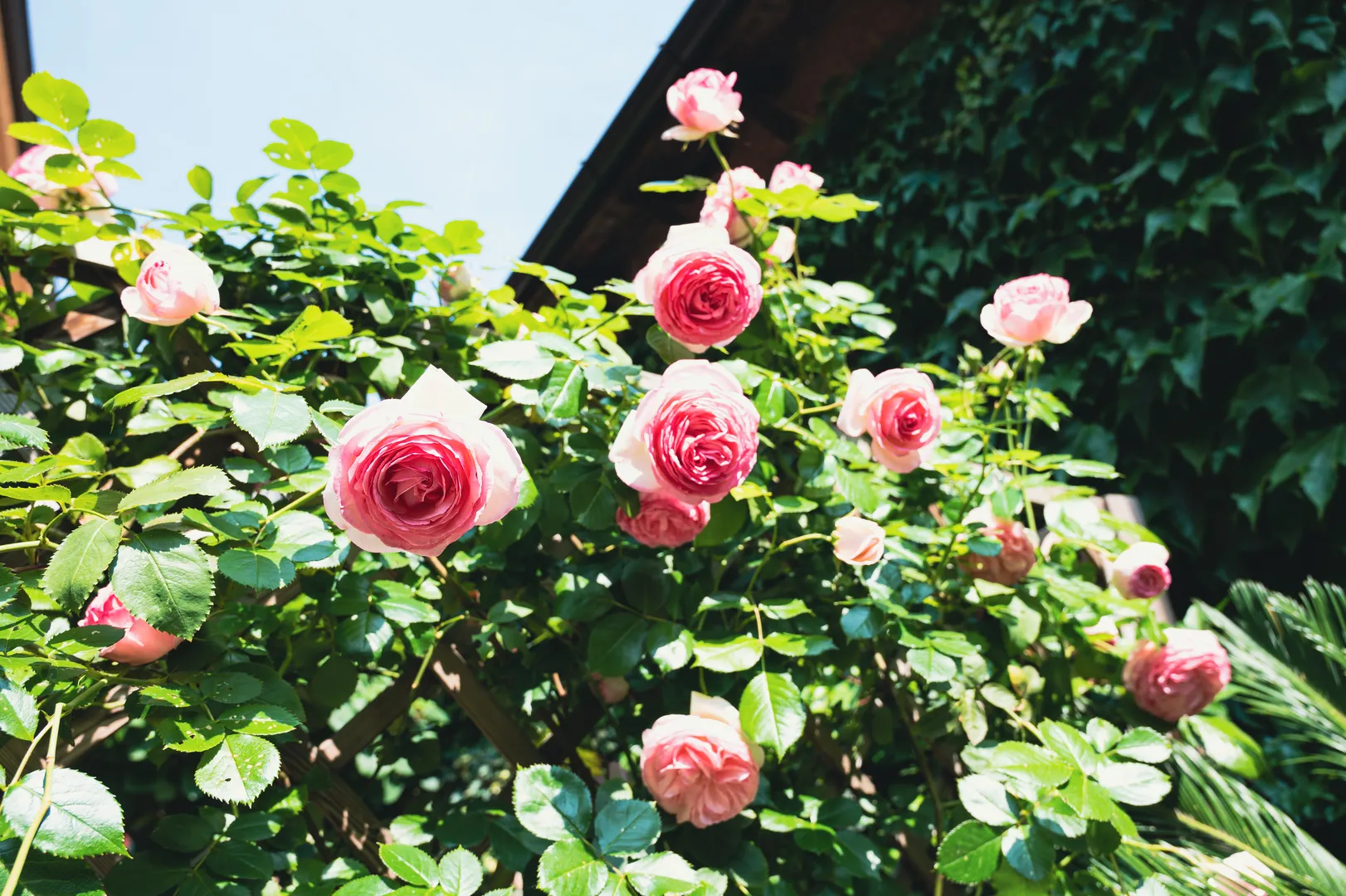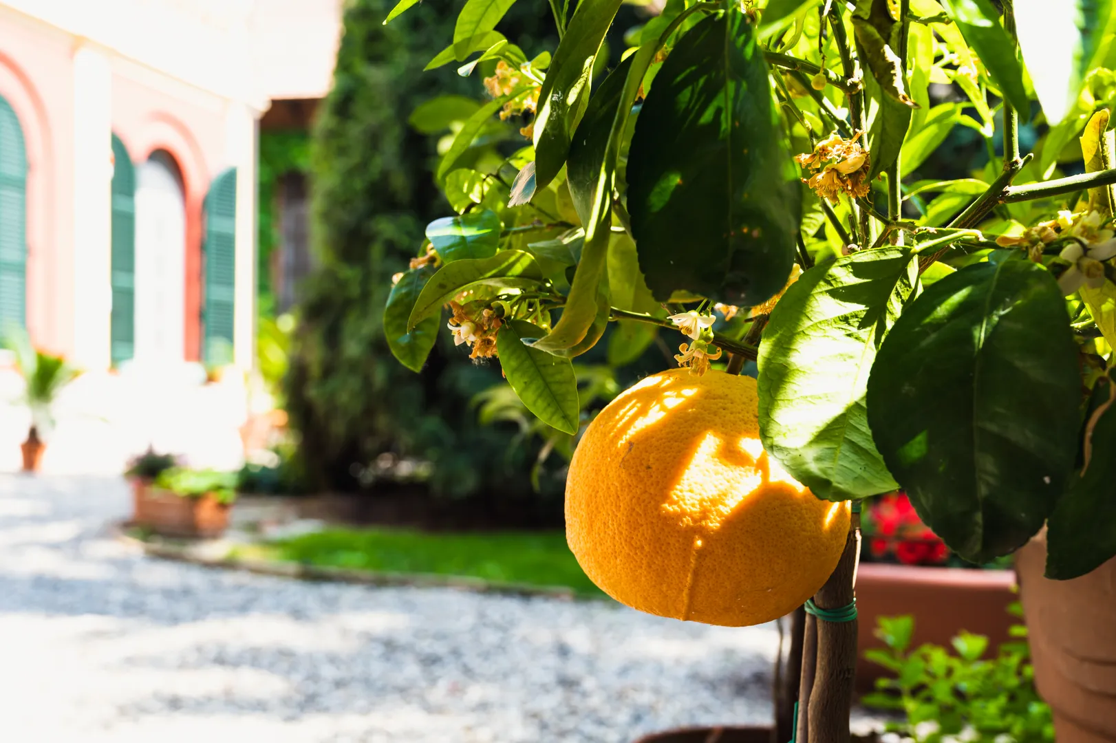 Nel giardino si incontra di tutto: alberature importanti come la magnolia; riunioni di agrumi in vaso, con aranci e pompelmi; siepi di gelsomino; aiuole di fragole; esuberanti cycas, le immancabili aromatiche; chiome dense come quella del pruno rosso, a cui sono state curiosamente appese tante volatili tillandsie, chiamate anche “piante del vento”. L’area è bordata a destra da una teoria di ortensie, che si interrompe a metà per lasciare spazio ai mughetti: si tratta di un ricordo della madre della proprietaria, li aveva piantati lei una decina di anni fa, come pure gli ellebori che fioriscono all’ombra del tasso.