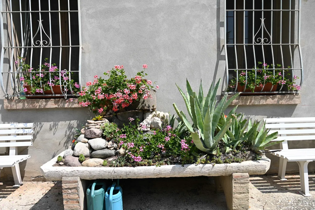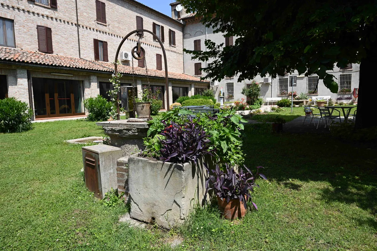 Oggi in questa elegante struttura vivono 41 ospiti, anziani autosufficienti o parzialmente autosufficienti, che sfruttano il giardino per chiacchierare e godersi la bella stagione, incontrare i parenti e ogni tanto anche prendere il sole. A garantire l’ombra ci pensano i tigli, i kaki, il pino e l’ailanto. Non mancano colorate aiuole, ricche di tagete, come quella che circonda il piccolo santuario dedicato alla Vergine. Accanto e sopra al pozzo crescono la bella di notte, il gelsomino e l’erba miseria. Vicino al vecchio tronco di un grande albero abbattuto spicca il giallo delle canne d’India.