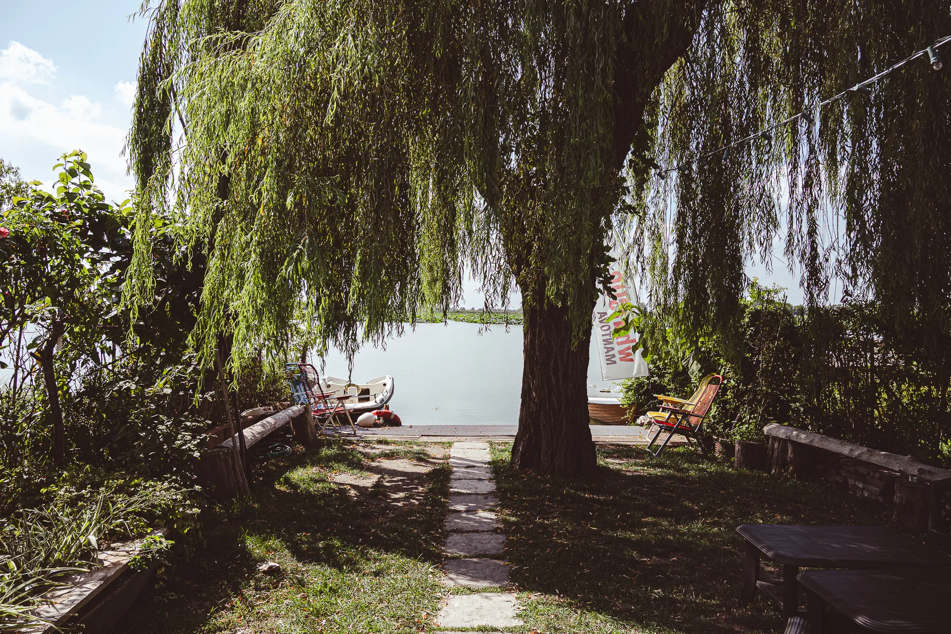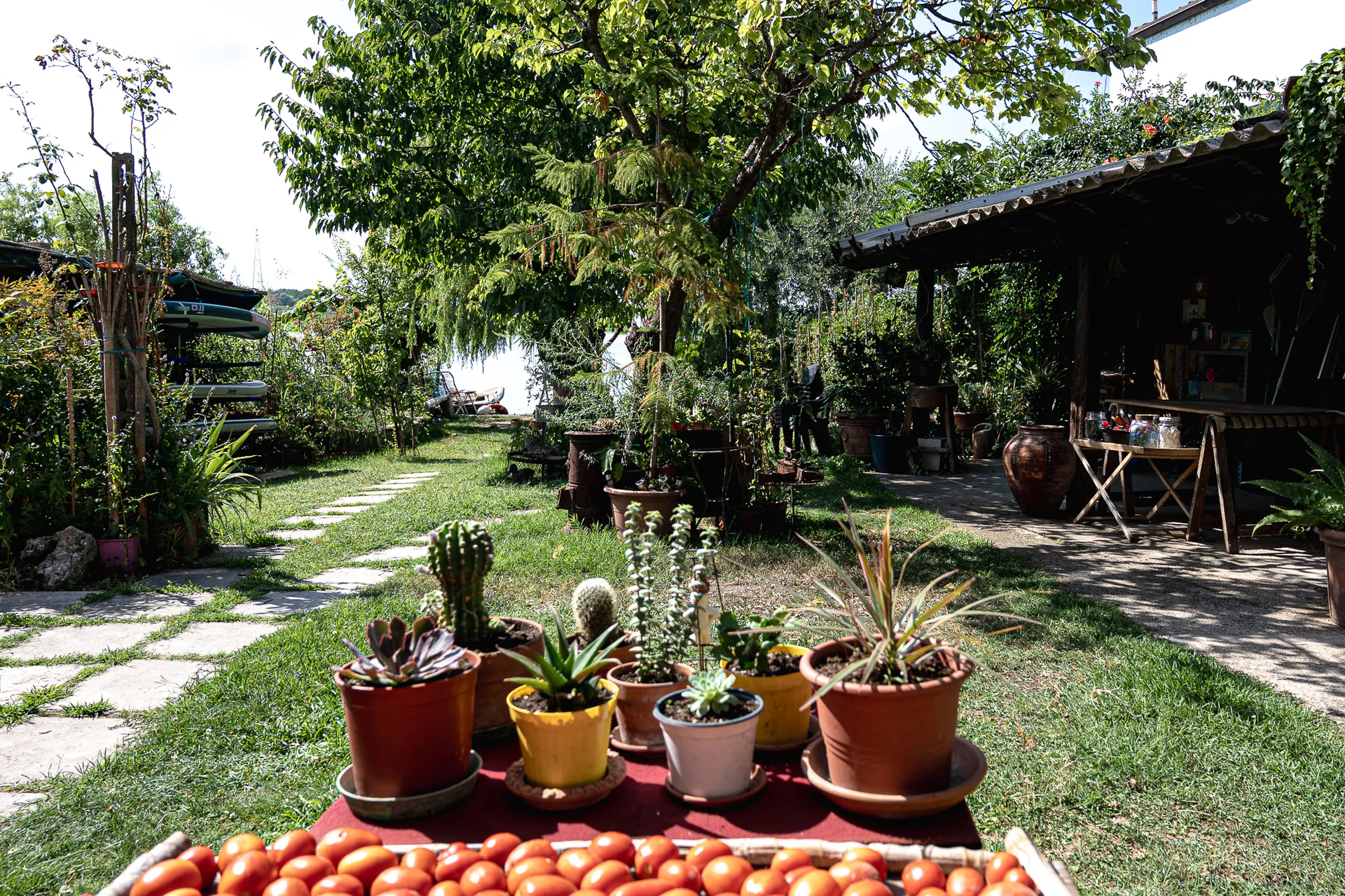 Da quando in qua i giardini stanno in equilibrio? Forse questo non è il primo aggettivo che viene in mente guardandosi attorno, ma prendendosi il giusto tempo per osservare quanto armoniosamente qui si incastrano e compenetrano ordine e disordine, volontà e casualità, può rivelarsi azzeccato. Dal salice piangente “piantato dal papà 52 anni fa” ai pomodori che crescono in fila, dalle sedie disposte attorno al tavolino basso alla vecchia barca trasformata in fiorieria: tutto qui ha il sapore della cura e dell’affetto, ma anche della spontaneità. La bellezza è voluta, è ricercata, è un’idea conosciuta e interpretata, ma non inseguita, non stereotipata. É viva, come vive sono le piante, come vivi sono gli oggetti della quotidianità, come vive sono le leggere onde che si allungano verso il prato. In questo spazio è facile immaginare la vita passata del borgo, nato come villaggio di pescatori, isolato dalla città, i giorni dimenticati che scorrono lenti e umidi. Ma è altrettanto facile immaginare il futuro, l’acqua che nuovamente diventa risorsa e linfa, non più funzionale all’alimentazione, alla sopravvivenza, ma paesaggio mobile su cui fondare ospitalità e intrattenimento, nella prospettiva – a lungo termine – di valorizzare il lago come luogo privilegiato per chi cerca lo sport e il relax.