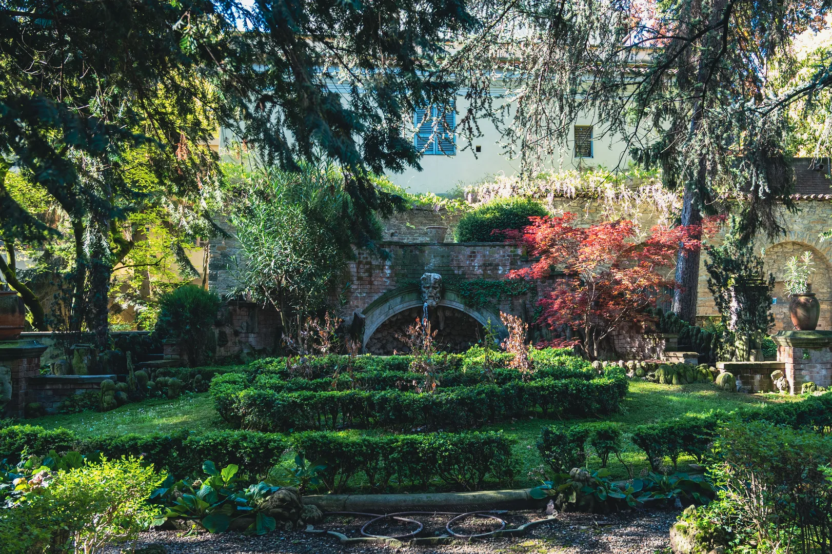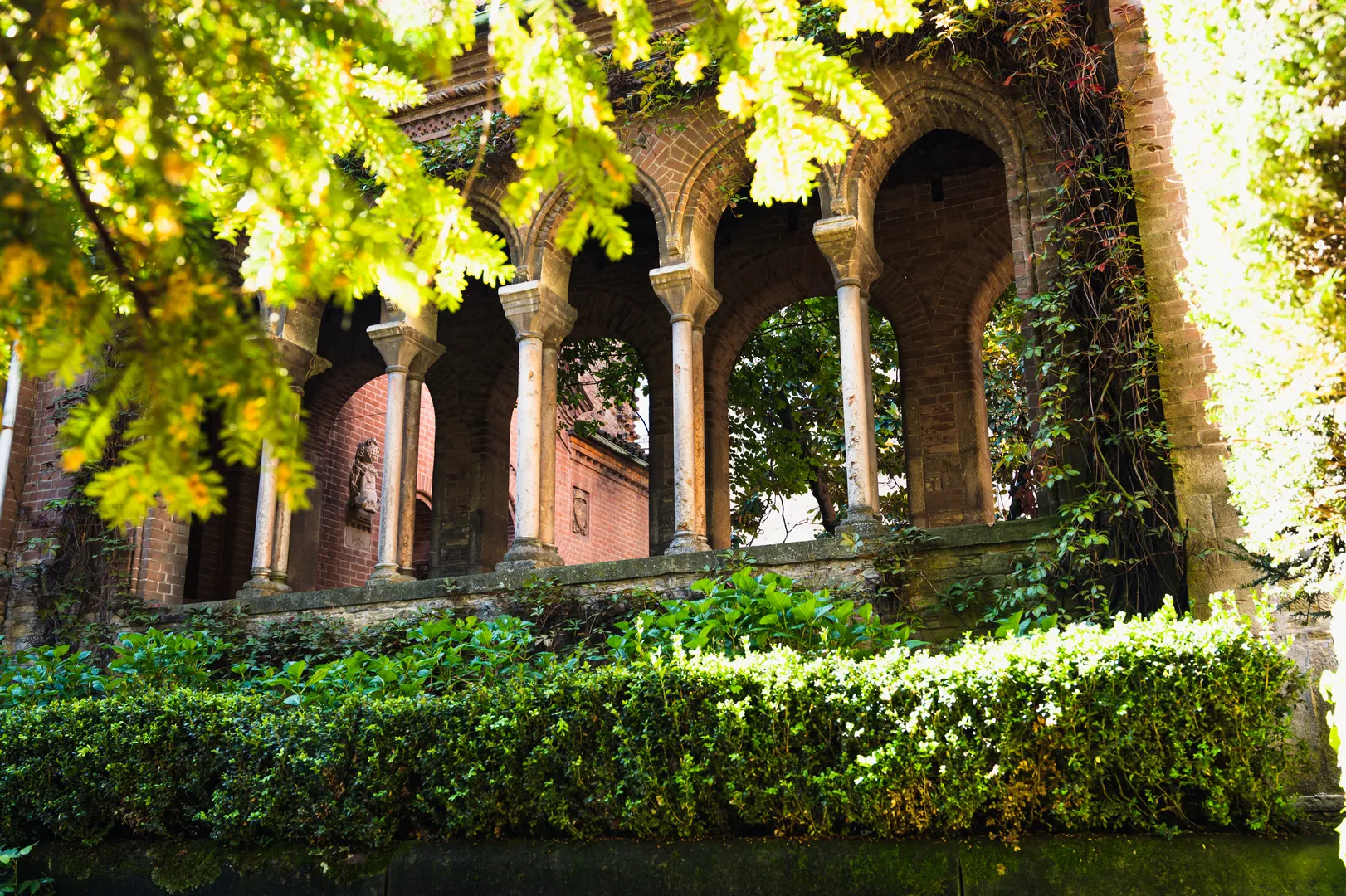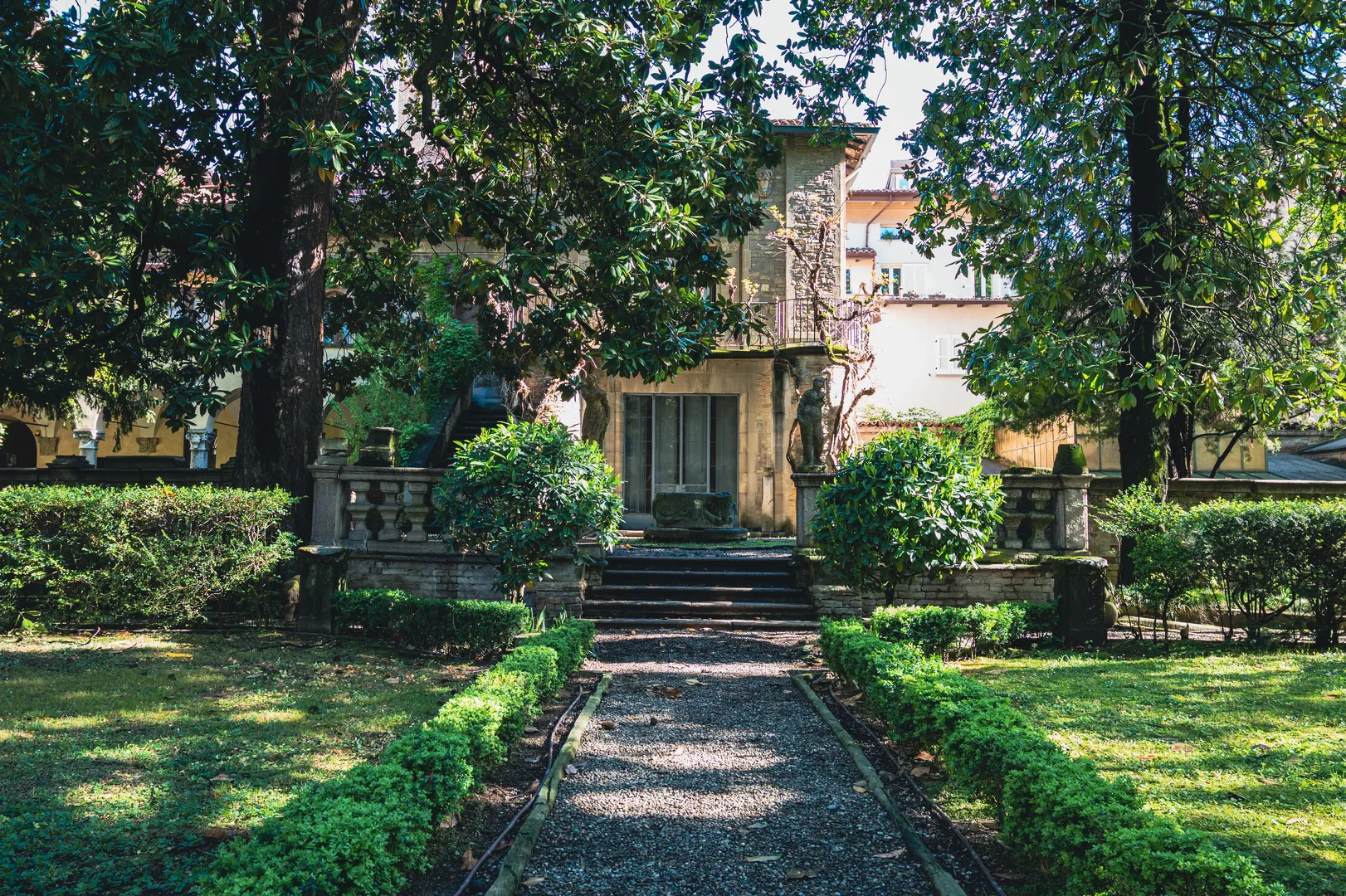 Via via che ci si inoltra nei sentieri si scopre l’anima paesaggistica, il gusto tutto pittorico della rovina. La tradizione italiana incontra la tradizione inglese, la regola si sfalda nel romanticismo, nella grotta, nel pensatoio. Si susseguono scorci prospettici, scalinate di pietra e dislivelli sostenuti da muretti. Lo scorrere del tempo si rappresenta artificialmente e fantasiosamente. Disseminati qua e là si trovano i reperti della collezione antiquaria iniziata in giovane età, quando il futuro professionista di grido era ancora uno studente fresco di diploma. Colonne, statue, capitelli, sculture e portali sbucano tra i rampicanti, sporgono dai cespugli. Superando la fontana col mascherone, popolata di pesci rossi, e salendo le scale che portano alla terrazza porticata affacciata su via San Siro, si incontra anche una guglia neogotica proveniente dal Duomo di Milano, acquistata negli anni Trenta e di cui ancora si conserva la fattura. Il carattere intimo e meditativo del giardino è amplificato dalle profonde ombre proiettate dagli alberi secolari e dai loro compagni più giovani. Crescono qui l’abete bianco, l’abete del Colorado, l’acero di monte, l’ippocastano, il carpino bianco, il cedro azzurro, il cefalotasso cinese, il cipresso di Lawson, il faggio, il faggio a foglia di felce, il gingko, la magnolia, la fotinia, l’abete rosso, l’abete orientale, il pino nero, la sofora, il tasso, la tuia orientale.