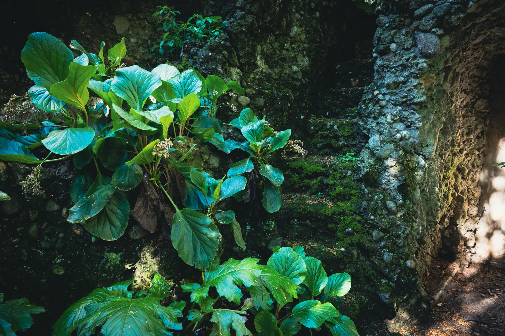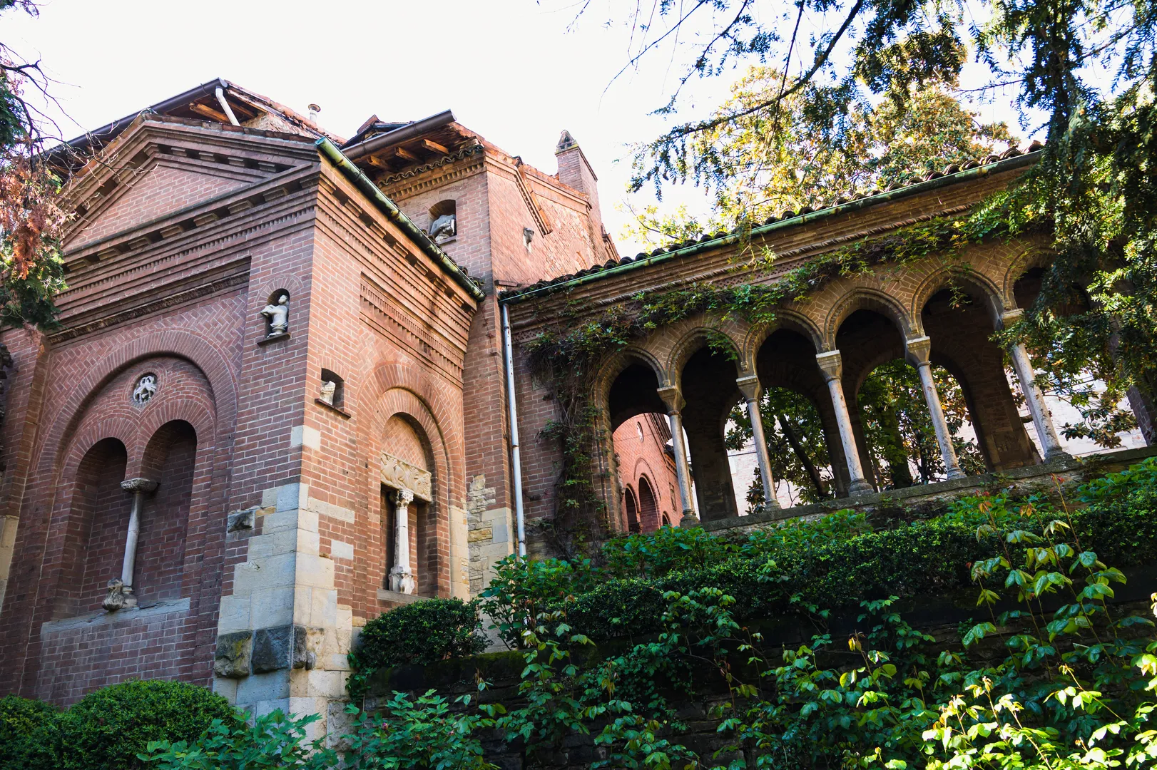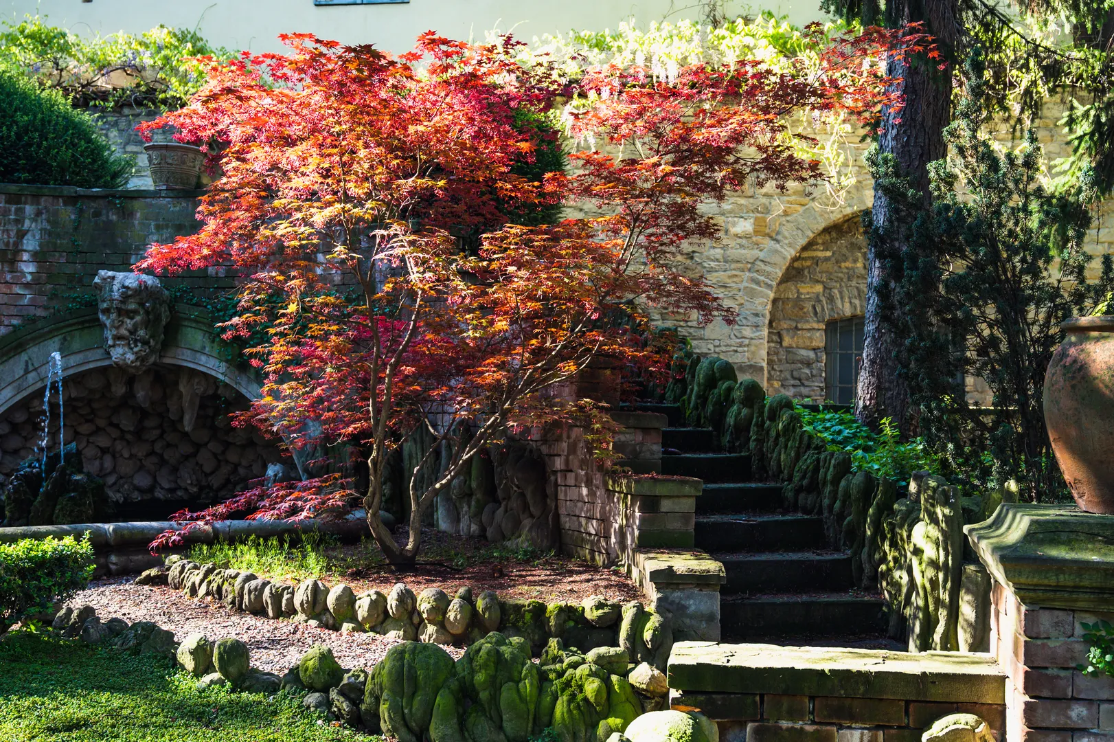 Via via che ci si inoltra nei sentieri si scopre l’anima paesaggistica, il gusto tutto pittorico della rovina. La tradizione italiana incontra la tradizione inglese, la regola si sfalda nel romanticismo, nella grotta, nel pensatoio. Si susseguono scorci prospettici, scalinate di pietra e dislivelli sostenuti da muretti. Lo scorrere del tempo si rappresenta artificialmente e fantasiosamente. Disseminati qua e là si trovano i reperti della collezione antiquaria iniziata in giovane età, quando il futuro professionista di grido era ancora uno studente fresco di diploma. Colonne, statue, capitelli, sculture e portali sbucano tra i rampicanti, sporgono dai cespugli. Superando la fontana col mascherone, popolata di pesci rossi, e salendo le scale che portano alla terrazza porticata affacciata su via San Siro, si incontra anche una guglia neogotica proveniente dal Duomo di Milano, acquistata negli anni Trenta e di cui ancora si conserva la fattura. Il carattere intimo e meditativo del giardino è amplificato dalle profonde ombre proiettate dagli alberi secolari e dai loro compagni più giovani. Crescono qui l’abete bianco, l’abete del Colorado, l’acero di monte, l’ippocastano, il carpino bianco, il cedro azzurro, il cefalotasso cinese, il cipresso di Lawson, il faggio, il faggio a foglia di felce, il gingko, la magnolia, la fotinia, l’abete rosso, l’abete orientale, il pino nero, la sofora, il tasso, la tuia orientale.