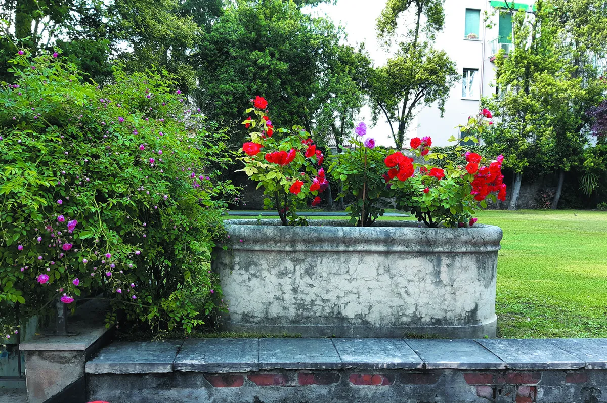 Con l’avvicendarsi delle generazioni, questo giardino si è adattato ai desideri e alle necessità. Per esempio la grande fioriera ovale in pietra si dice fosse stata in origine una vasca da bagno. Nulla si butta e tutto si ricicla, come ben sanno le tre roselline che ogni anno regalano una fioritura di un bel rosso acceso. A nascondere la grata verso i garage ci pensa una leggiadra rosa gallica.