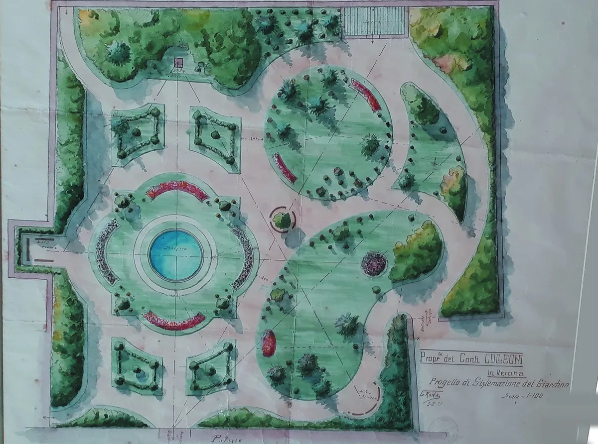 Come gli interni, anche gli esterni sono stati più volte rimaneggiati. C’è un acquarello del 1927, disegnato dal celebre architetto del paesaggio Giuseppe Roda, che mostra come appariva all’epoca il giardino: la pianta era classicamente italiana, con un’aiuola rotonda, una quadrata e una a fagiolo, con vari tipi di alberature e cespugli di verdi diversi lungo il muro di cinta. La sistemazione attuale è frutto degli anni Sessanta.