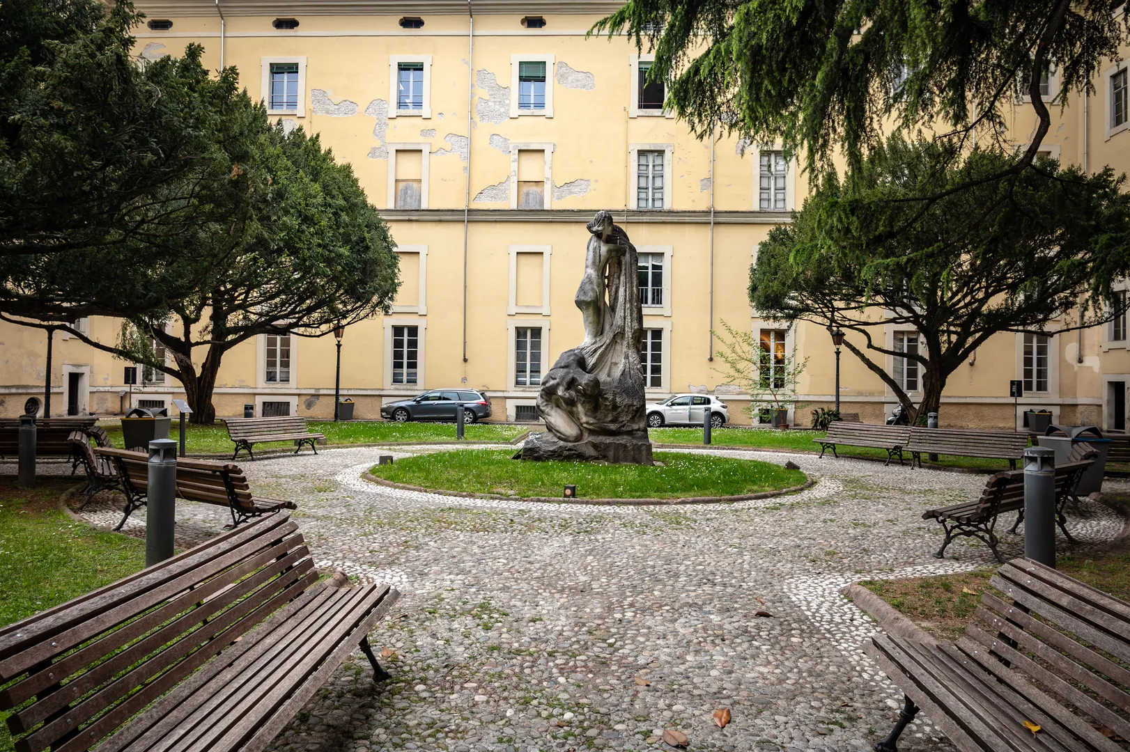Dall’ingresso si passa all’atrio monumentale e al giardino. Per secoli l’area verde venne curata dai Gesuiti, a cui erano stati affidati i corsi di Lettere, Filosofia e Teologia. Oggi lo spazio è diviso in quattro grandi aiuole, separate dai camminamenti. Tra gli alberi spiccano i tassi plurisecolari, gli stupefacenti alberi di alloro, la magnolia e gli aceri. Al centro si trova la statua realizzata da Carlo Fontana, scultore famoso soprattutto per la colossale quadriga collocata sopra al Vittoriano di Roma. Per l’Università ha rappresentato la Grecia Victa, abbinata alla celebre citazione dalle Epistole di Orazio: «La Grecia conquistata conquistò il selvaggio vincitore». Il messaggio è semplice, e ben si adatta ad esaltare il ruolo dell’ateneo: Roma conquistò la Grecia con le armi, ma la cultura dei dominati riuscì a cambiare il carattere, a civilizzare e quindi a vincere i conquistatori.