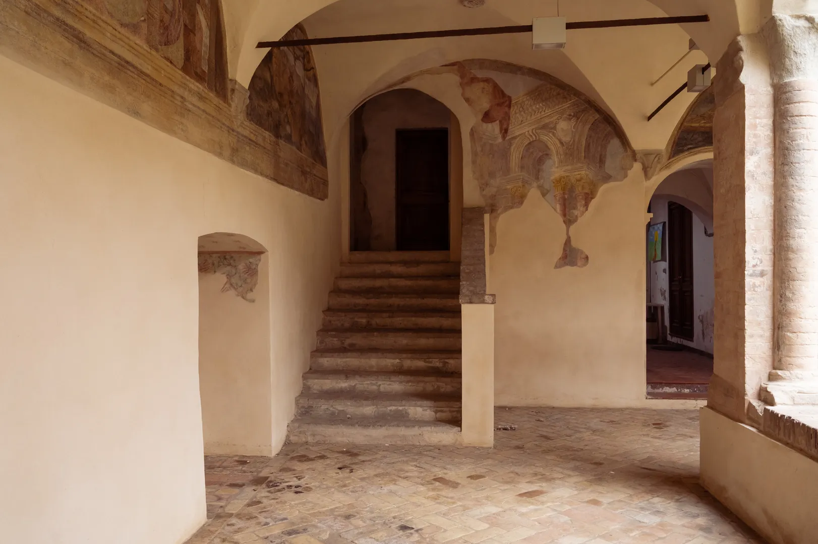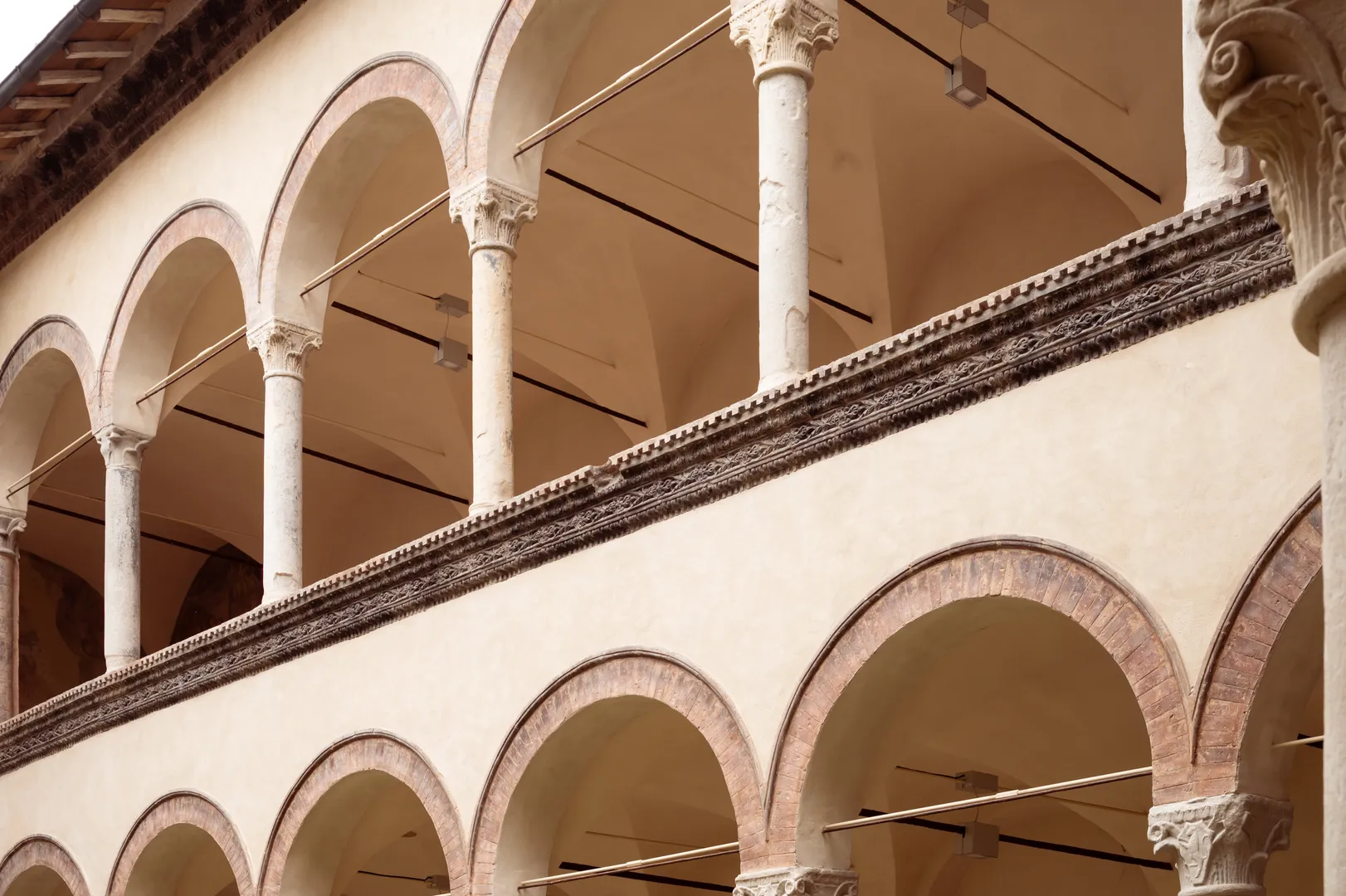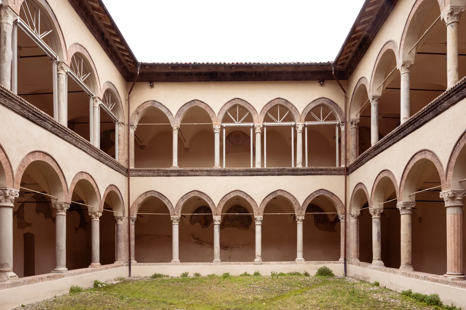 L’originale splendore era decisamente compromesso, e certo i bombardamenti della Seconda Guerra Mondiale e l’incendio che colpì la struttura nei primi anni Cinquanta non furono d’aiuto. I danni subiti motivarono la decisione di demolire il secondo chiostro, il più grande, che si trovava dove oggi sorge la scuola. Il più piccolo, di fattura rinascimentale, circondato da due ordini di arcate, è stato restaurato dopo lunghi anni di abbandono. Da notare i capitelli decorati con il toro, simbolo della famiglia Carissimi. Tra le colonne invece si possono apprezzare due fusti in marmo rosso di Verona, che appartenevano al vecchio teatro romano.