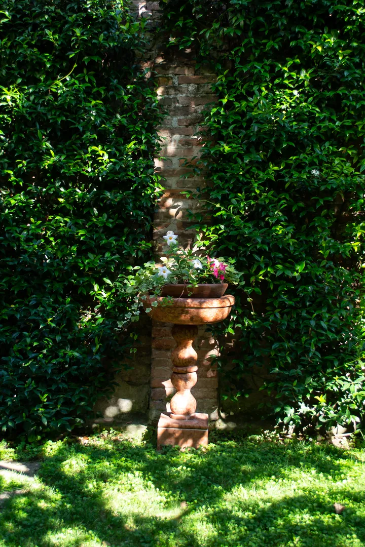 Le rose colorano in primavera la bella cancellata in ferro battuto, a cui dalla corte si accede al prato. Tra i fiori anche le ortensie, le azalee, i gelsomini, le camelie e altre essenze stagionali. Grazie alla presenza dei tanti alberi, che crescono qui e nei giardini vicini, non è insolito avvistare o ascoltare in questa zona i richiami dei picchi, delle civette e dei falchetti. Oltre a una piccola comunità di gatti domestici, è presente da molti anni anche un grosso rospo, che si muove silenzioso nelle ore notturne.