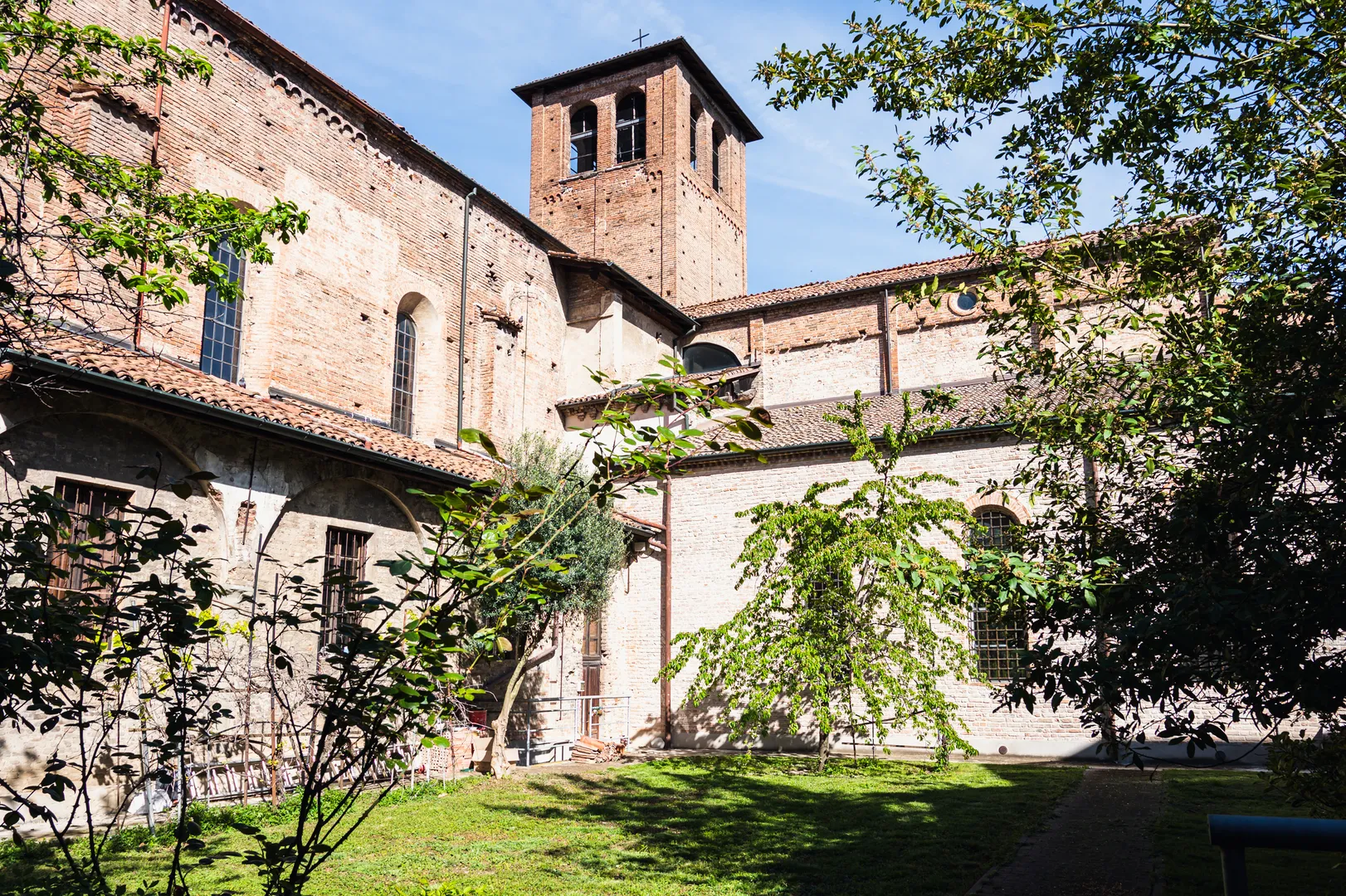 La chiesa e il convento di San Giovanni risalgono al XIII secolo e furono edificati dai domenicani – arrivati in città nel 1220 – nei pressi del rio Beverora, in un terreno ricevuto in donazione. All’epoca però esisteva già un luogo di culto dedicato al santo, quindi per distinguere la nuova costruzione venne aggiunta la specifica dedicata al canale. Oggi per accedere al giardino basta entrare nella porta situata accanto all’ingresso principale della chiesa. Si incontra un lungo corridoio, dove vale la pena notare in fondo a sinistra il monumento sepolcrale dei Guadagnabene, famiglia di banchieri e mercanti, particolarmente operante tra il Duecento e il Trecento. I suoi interessi e commerci – inerenti soprattutto tessuti e lane – superavano ampiamente i confini nazionali, raggiungevano l’Irlanda e la Cina. I Guadagnabene – nomen omen – furono inoltre tra i finanziatori dei Re di Francia e d’Inghilterra: supportarono economicamente le crociate volute da Luigi IX e prestarono denaro a Enrico I. Il loro sepolcro risale al 1365. Scolpito nel marmo rosso di Verona, presenta la raffigurazione dell’Agnello mistico, attorniato da due croci greche e altri simboli ornamentali, ed è sormontato da un’edicola a colonnine binate che racchiude la pittura muraria – purtroppo parzialmente degradata – della Madonna con Gesù Bambino, compresa tra i due stemmi della famiglia.