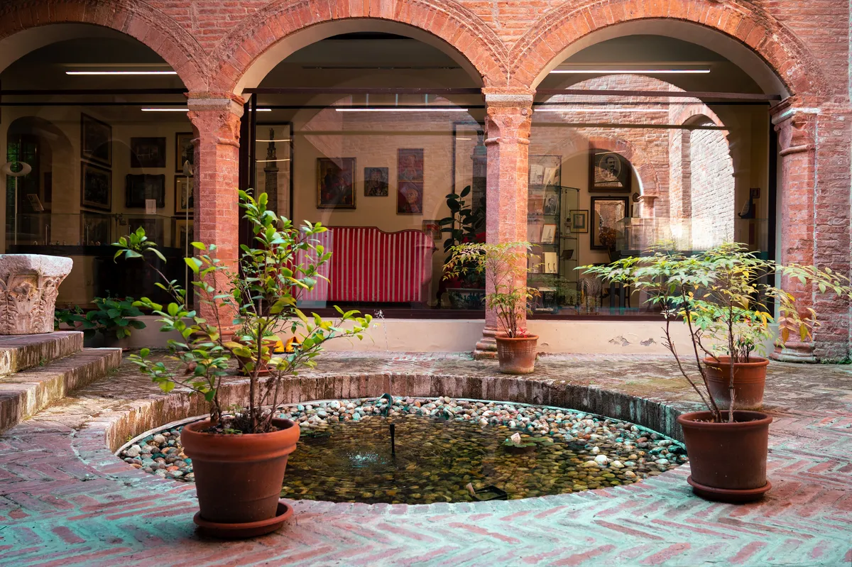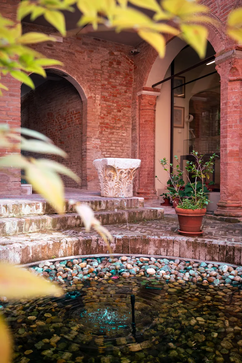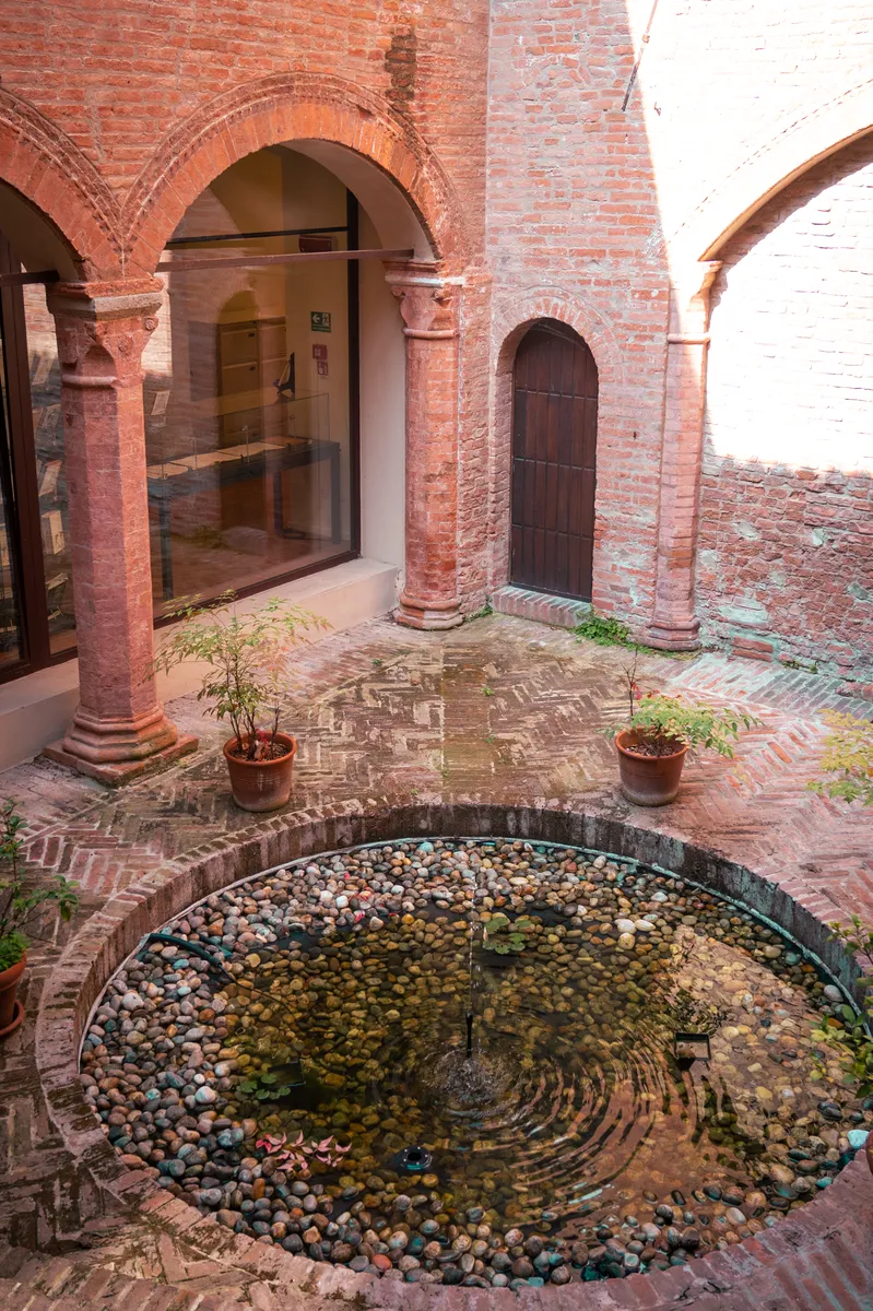 Così nel 1963 descriveva Bottoni il primo cortile, che cercò di valorizzare recuperando l’architettura quattrocentesca, scoprendo i basamenti dei pilastri ottagonali e ricordando – tramite una fontana – i resti di una vecchia cisterna.