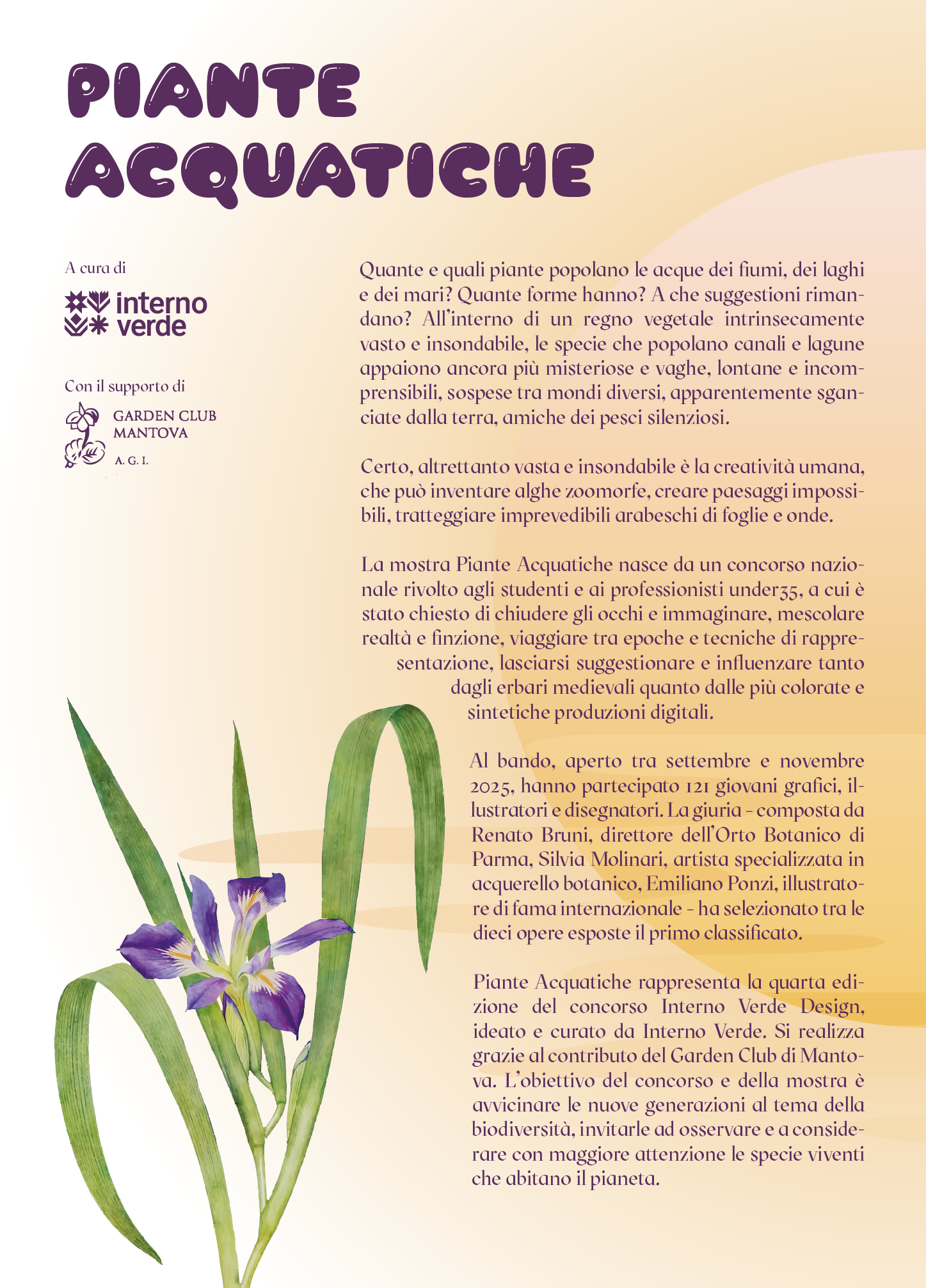 Invita i partecipanti a cimentarsi con il tema delle piante acquatiche, siano esse di mare, di lago, di laguna, di palude o di fiume, e a produrre una tavola coinvolgente e originale, con tecnica libera, che le possa rappresentare singolarmente o in gruppo, realisticamente o fantasticamente.