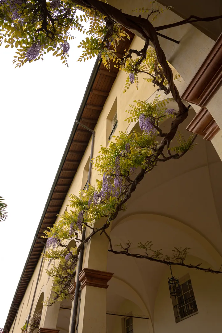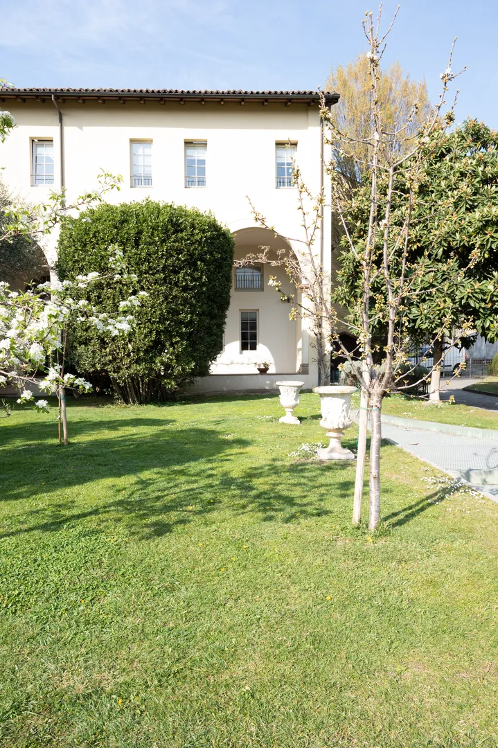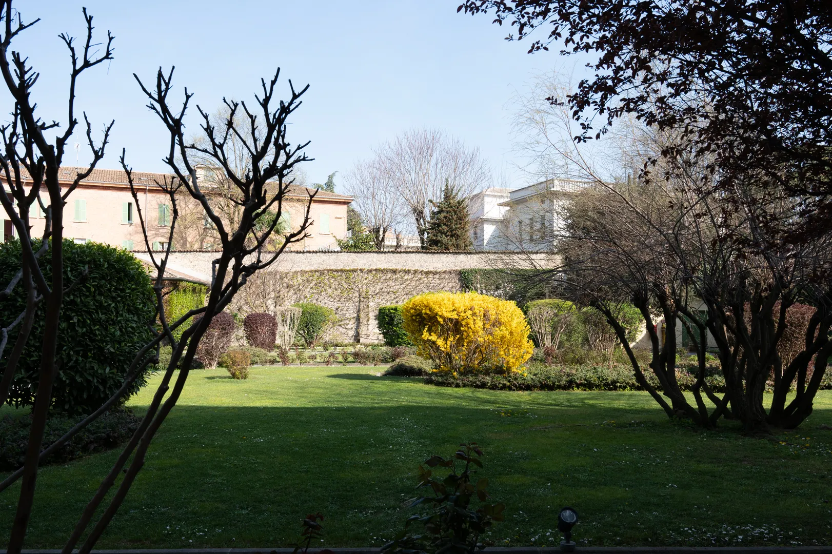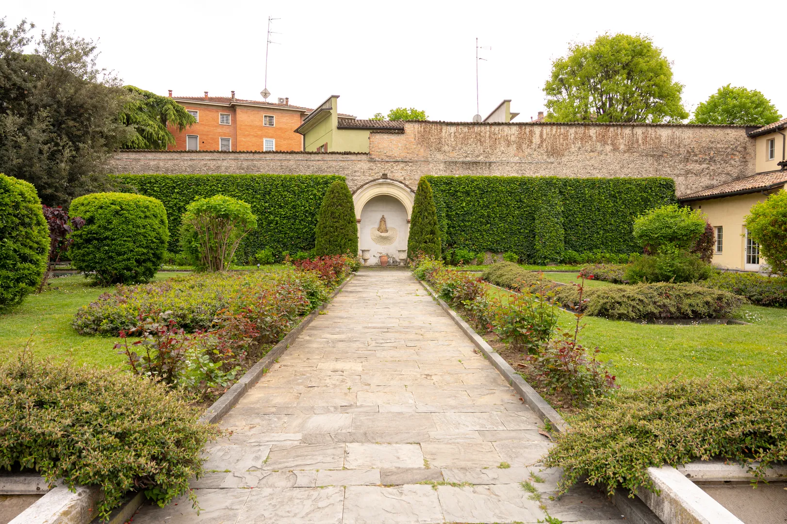 L’acquisizione da parte del Gruppo Pizzarotti è dunque tutto sommato recente, così come il minuzioso restauro che ha riportato in vita lo splendore dell’antico giardino rinascimentale. Il disegno dell’area è rimasto lo stesso, come si può notare osservando le piante settecentesche del Sardi. L’unica modifica accorsa riguarda il camminamento centrale, che una volta spaccava lo spazio in due rettangoli asimmetrici, sostituito da una divisione in quadranti, caratterizzati dalla colorata presenza delle tante varietà di rose. Da notare la bella vera da pozzo, le fontanelle e la cappellina presidiata dalle tuie, oltre ovviamente alla ricca composizione vegetale. Insieme alle palme e all’altissimo alloro, spicca la folta compagnia degli alberi da frutto: giuggioli, nespoli, ulivi, noccioli, meli, peri e kaki. Addossate ai muri crescono la lavanda, il rosmarino e le ortensie.