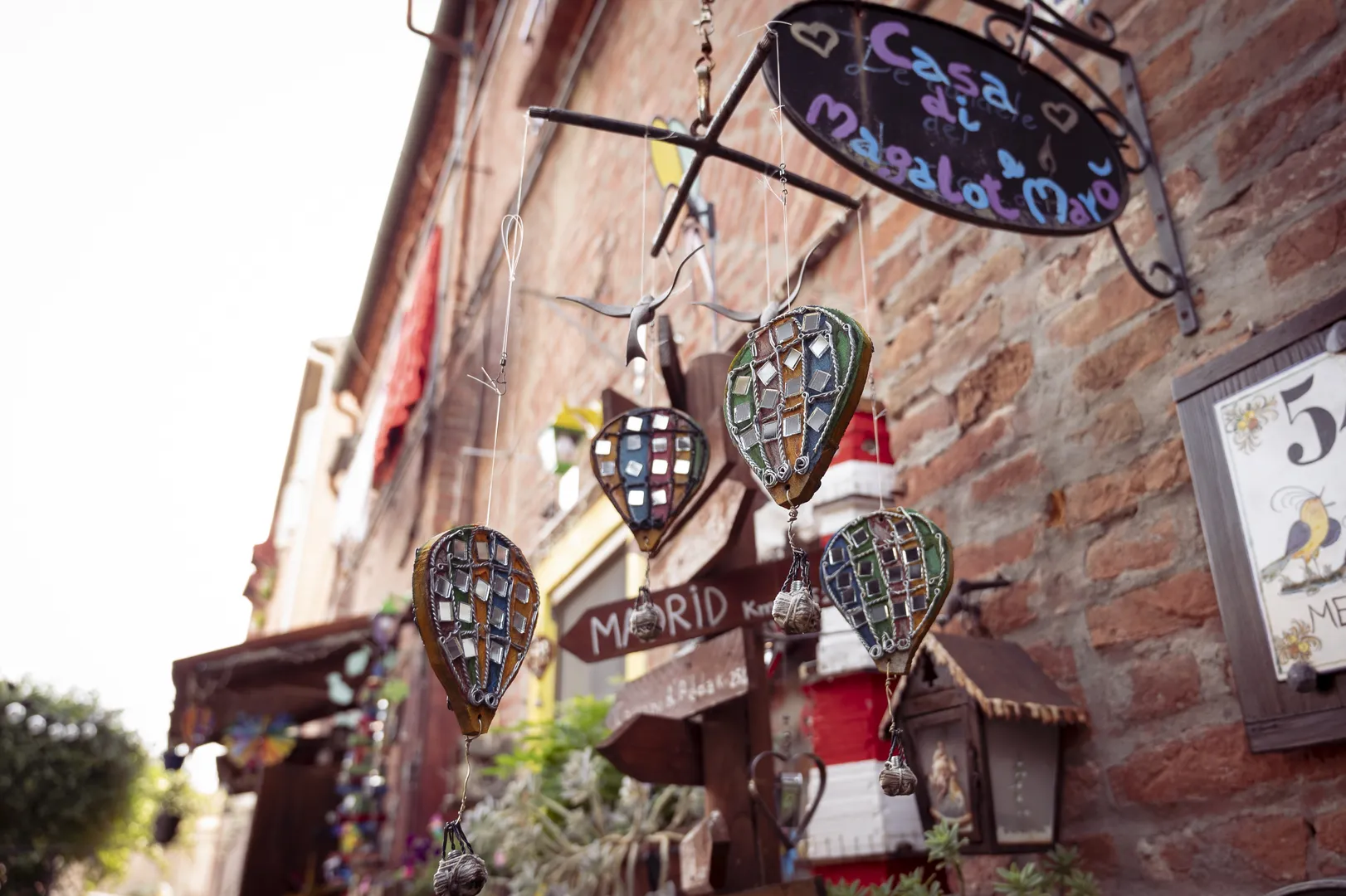 La struttura una volta era molto più grande: oggi conserva un solo chiostro, ma in origine ne aveva tre. Porzioni dei vecchi portici, tracce dei capitelli e delle logge distrutte si leggono tra i rampicanti e le chiome degli alberi, aggiungendo un sapore antico e vagamente romantico a un luogo altrimenti caratterizzato da una decisa e squillante vivacità. I proprietari, celebri mimi, si sono sbizzarriti nelle decorazioni e negli arredi: vetri e cristalli riflettono a terra i raggi solari, creando meravigliosi prismi iridescenti, mongolfiere giocattolo e velieri volanti percorrono la facciata dell’abitazione. Tutto qui è colore, gioia di vivere e fantasia. Da non perdere il misterioso angolo dedicato agli alberi piccoli e il giardino più piccolo del mondo.