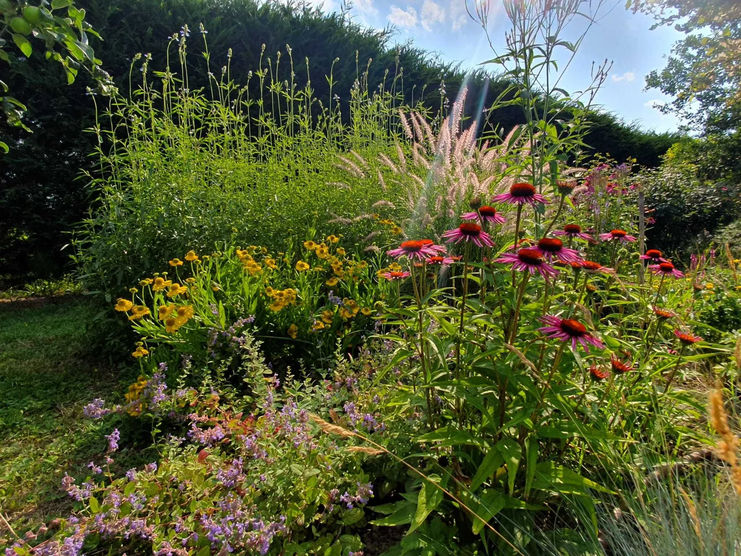 Vicino alla siepe che separa il giardino dai campi, chiazzano il verde del prato una serie di variopinte aiuole ovaleggianti, che assecondando la moda inglese si compongono di erbacee perenni. Ogni anno si compone una nuova aiuola, studiata per esprimere in tutte le sue sfaccettature un colore, un sentimento, un’emozione. C’è per esempio l’aiuola romantica, dedicata al viola, con la verbena, l’echinacea, le rose Golden Celebration, la veronica e diversi tipi di salvia, come la amistad e la caradonna, insieme alle graminacee come la festuca il miscanthus. C’è quella estiva, squillante di giallo, con l’achillea e la rudbeckia, il penniseto, la verbena hastata, l’echinops blu elettrico, chiamato anche cardo pallottola.  «Ho iniziato con le bulbose, con gli iris, i tulipani, l’aquilegia. Poi ho sperimentato con i geranium, la rosa Mutabilis, gli aster che sono settembrini. Ho provato a unire il al viola della buddleia il rosso, colore con il quale non ho avuto subito il coraggio di cimentarmi, con l’achillea terracotta, la crocosmia, il giallo dei coreopsis, gli helenium». In fondo si trova il frutteto, con gli albicocchi, le susine, il ciliegio. L’orto – dove d’estate si coltivano fragole, melanzane, peperone e pomodori, che d’inverno cedono il passo al radicchio e ai cavoli – è circondato dai carciofi e dalla verbena bonariensis. «Si piantano da sole, le trovo un po’dappertutto e le accolgo volentieri». Vicino al capanno degli attrezzi c’è la nursery, ovvero una zona dedicata alle talee: «ogni aiuola comprende circa 50 piante, sto imparando a coltivare quelle che mi servono per le sostituzioni, altrimenti si spende troppo e magari quando mi serve una certa varietà non la trovo più».