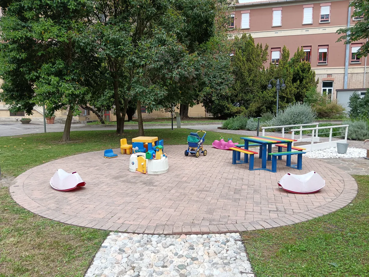 Il valore terapeutico del verde si può annoverare tra i concetti scordati e ritornati. I primi ospedali moderni – in Europa e in Italia – nascevano immersi nei parchi, circondati da grandi alberature, con i reparti disseminati come isole in mezzo alla natura. Anche lo storico Arcispedale Sant’Anna, nella sua sede novecentesca di corso Giovecca, era nato così. Progettato dall’ingegnere Filippo Galassi, completato nel 1927, dalle sue finestre si potevano guardare le chiome dei cedri fluttuare nel vento, aspettando l’esito di un esame si poteva fare due passi tra le aiuole. Il problema ovviamente non riguarda Ferrara, il pensiero si muove come un’onda e tutti insieme la si cavalca: ecco, per molto tempo tutti insieme abbiamo cavalcato l’idea che ciò che solamente conta quando ci si cura, è la cura. Gli ospedali “nuovi”, costruiti nei decenni del boom economico, sono stati disegnati in funzione esclusiva di ciò che dovevano custodire, di ciò che doveva giustamente funzionare al loro interno. Oggi finalmente ci si torna a occupare anche di ciò che sta all’esterno, si recupera un sapere antico: il profumo di una rosa fa bene all’animo, allo spirito, e anche al corpo. Dentro questa cornice si inquadra il Giardino nel Cuore, allestito nel cortile del “vecchio Sant’Anna”, oggi Casa della Salute, Cittadella di San Rocco. Da quando l’ospedale vero e proprio è stato trasferito nella frazione di Cona, nel 2012, l’elegante struttura di corso Giovecca, sempre gestita da Asl Ferrara, ha cambiato utilizzo: ospita servizi di promozione della salute, ambulatori destinati alla cura di varie patologie e all’accoglienza di fasce specifiche di utenti. Ospita anche, dal 2019, il Giardino nel Cuore, ovvero uno spazio attrezzato per i bambini e i ragazzi con problemi neuromotori e sensoriali, sostenuto e promosso dall’Associazione Vola nel Cuore, con il supporto del Garden Club, che si è impegnato nella progettazione botanica. Qui i piccoli pazienti possono imparare a utilizzare, in un contesto sicuro, le carrozzine a spinta o elettrificate, acquisiscono autonomia e sicurezza nei movimenti. Per i bambini ciechi e ipovedenti sono stati realizzati percorsi sensoriali con erbe aromatiche e officinali, che facilitano l’orientamento.