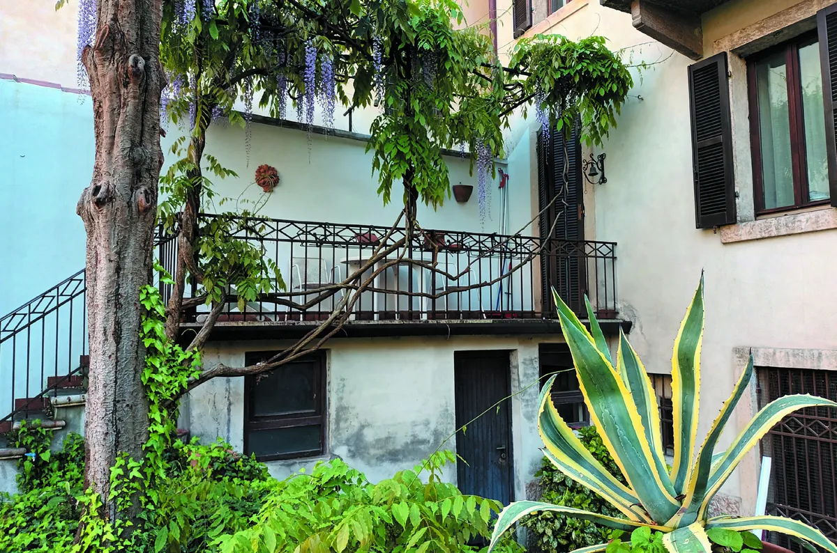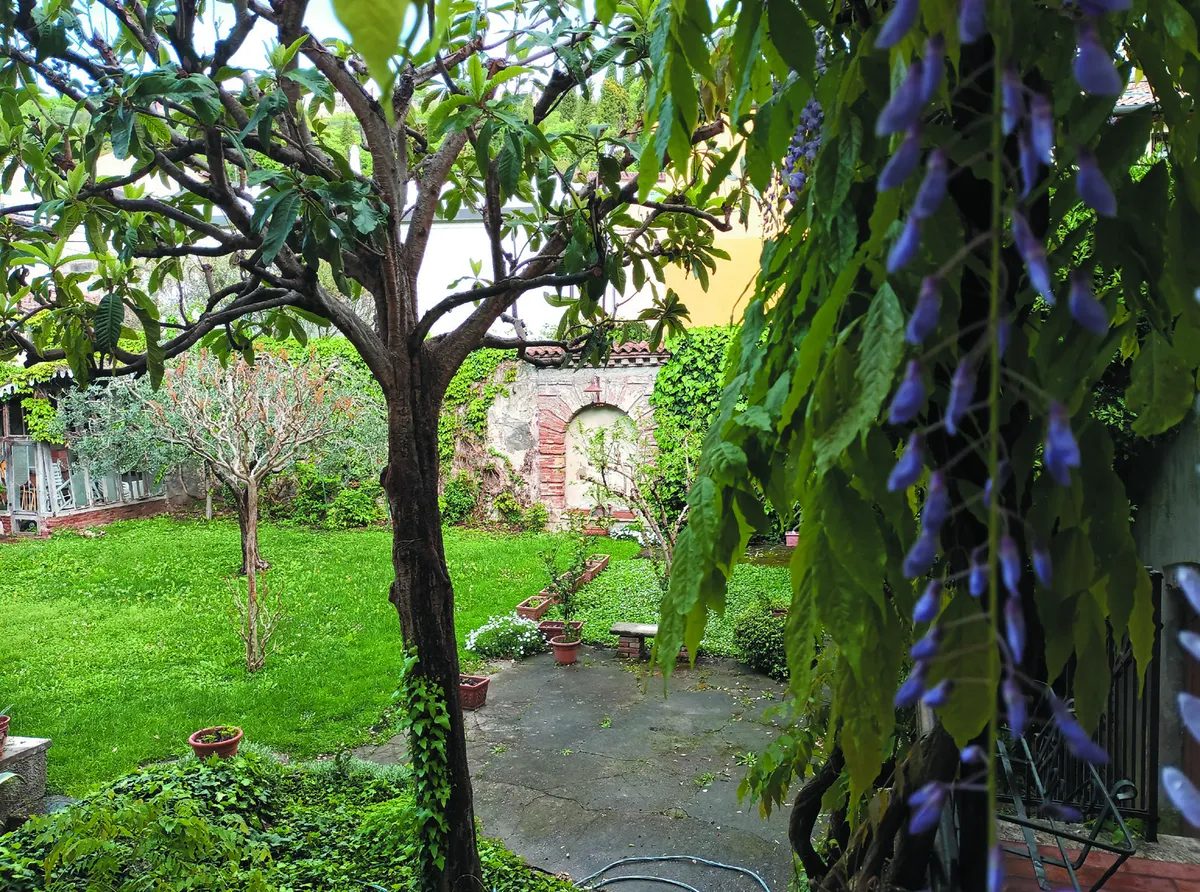 Si notano sei possenti tronchi biancastri che appartengono a un alloro centenario: si sono dissetati nel corso dei decenni al vecchio pozzo che sta subito lì sotto. Lo sguardo può scorrere tra ortensie, gelsomini che si arrampicano sul muro, quattro Agapanthus in vaso, dai fiori azzurri, che fronteggiano una siepe di pitosfori nani. Ecco lassù due piante di limoni da cui la padrona di casa trae un delizioso limoncello. Riuscite a immaginare un simile trionfo di colori e di profumi?
