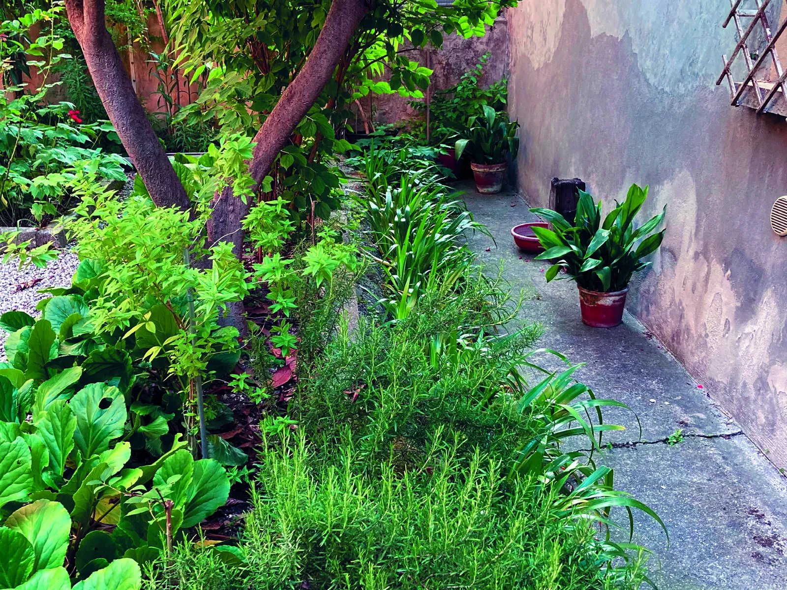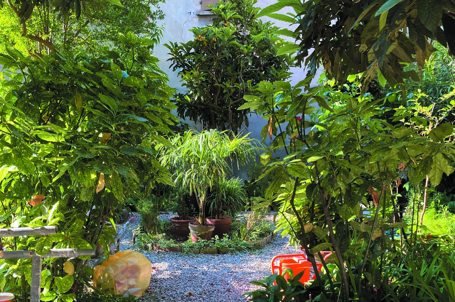 Anche se rivolto a nord e quasi sempre in ombra, in questo pezzetto di terra si impara che cosa vuol dire fare giardinaggio, che è anche saper scegliere le piante che stanno bene insieme, quelle che si fanno compagnia e vanno d’accordo e quelle da sistemare lontane, così come succede in ogni condominio. Una piccola oasi: calicanti, rose e bellissime aucube, e una lunga fila di Neomarica gracilis che si propagano velocemente lungo quello che era un fosso ora interrato, in inglese significativamente definiti walking iris.