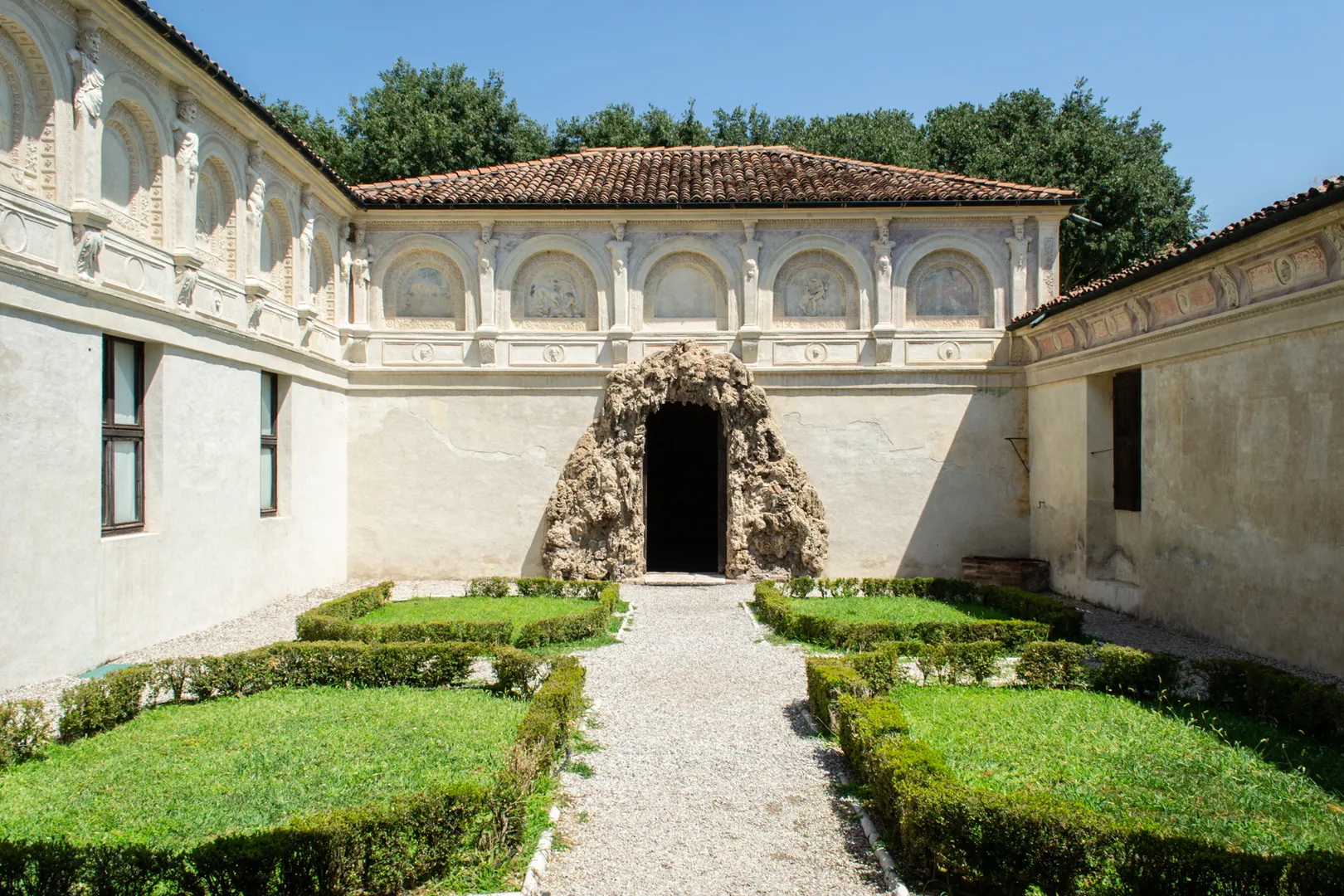 Probabilmente l’ispirazione di creare per pochi amici intimi un ambiente raccolto venne al duca da sua madre, Isabella d’Este. La nobile ferrarese infatti, circa dieci anni prima, aveva voluto per sé all’interno del Palazzo Ducale un luogo molto simile: completamente invisibile dall’esterno e arricchito di un’elegante loggia. Per arrivare al misterioso scoperto bisogna attraversare il vestibolo collegato alla camera di Attilio Regolo, che deriva il suo nome dal condottiero rappresentato a parete. Qui la pavimentazione è realizzata in ciottoli di fiume, in mezzo ai quali stavano nascoste le bocchette di piombo usate per i giochi d’acqua. Pare infatti che, attraverso un sapiente manovratore o grazie a degli automatismi, Federico II si divertisse a spruzzare i visitatori con zampilli a sorpresa. All’interno della loggia si può ancora leggere buona parte del raffinato sistema iconografico, dove si incontrano Bacco e Arianna, Sileno sulla biga e il corteo nuziale di Peleo e Teti, le imprese gonzaghesche del Monte Olimpo e del Boschetto.