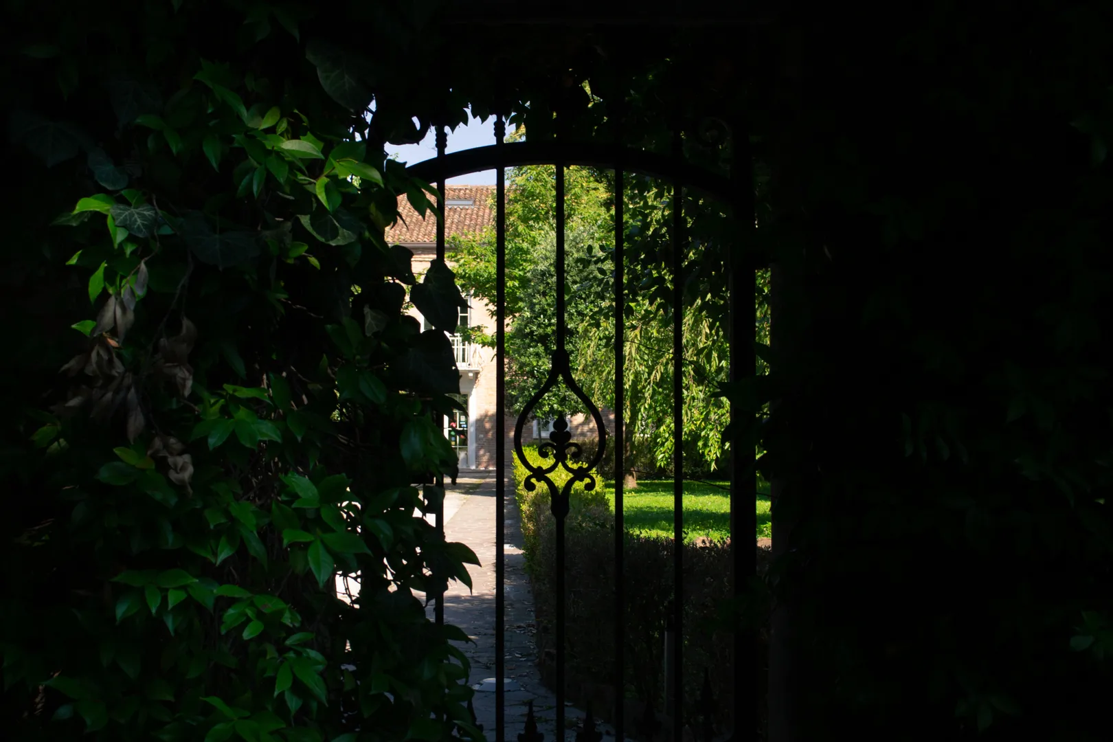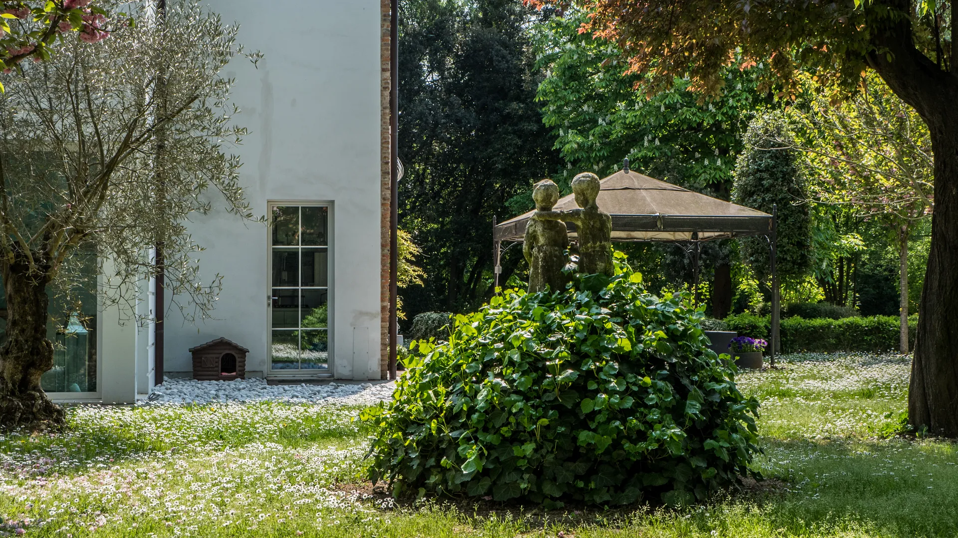 Il giardino ha uno stile inglese, ma il verde non è padrone assoluto: la prospettiva centrale del vialetto d’accesso ritaglia tramite le siepi di bosso uno spazio solo per l’uomo. Se si passeggia lungo la stradina prima della falciatura, il candore della ghiaia si moltiplica nel biancheggiare di milioni di margherite sul verde fosco dei prati. Camminando sotto i rami di alcuni ciliegi si scorge la pergola tappezzata di rose: una statua fa capolino tra le fronde mentre nevicano petali di glicine.