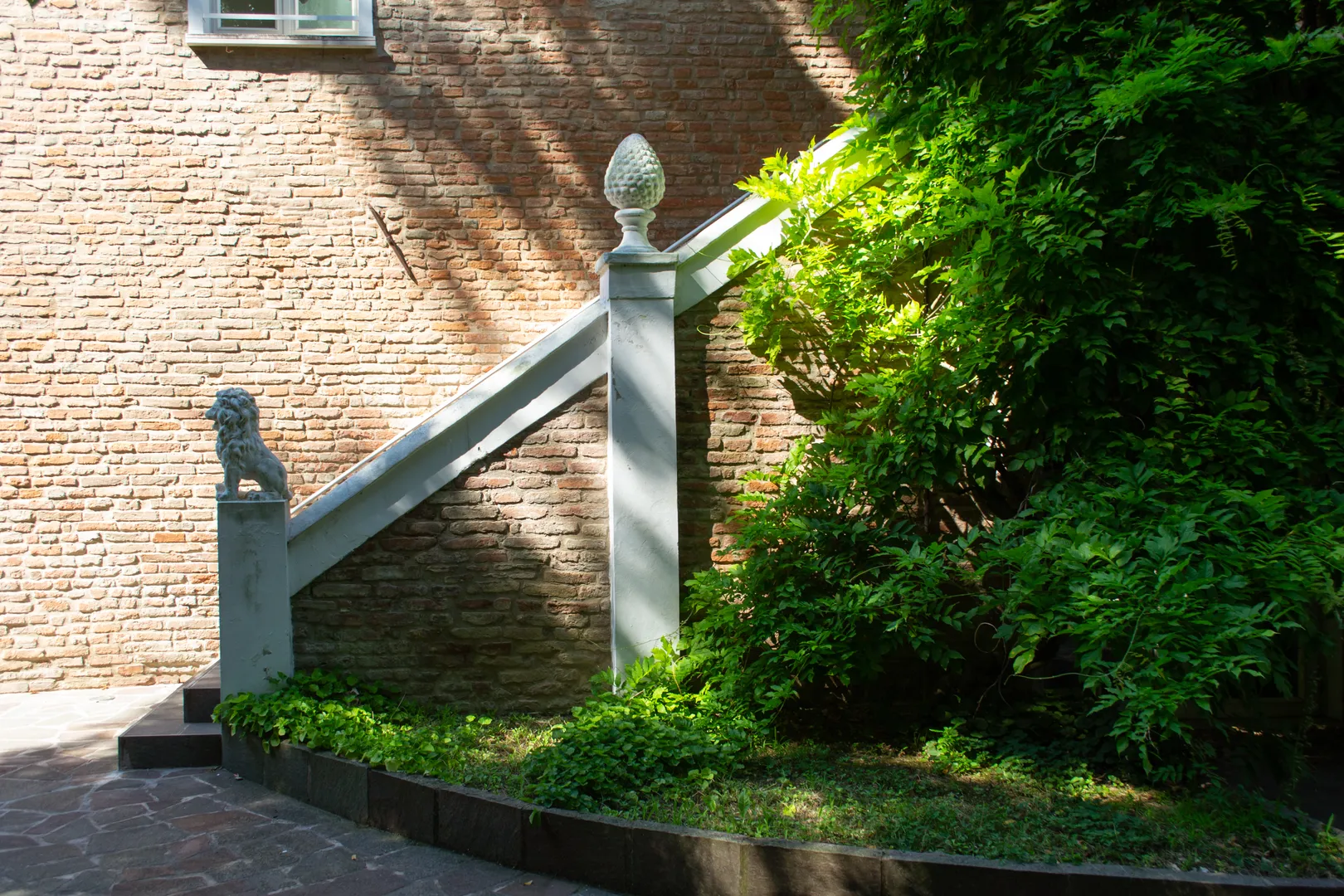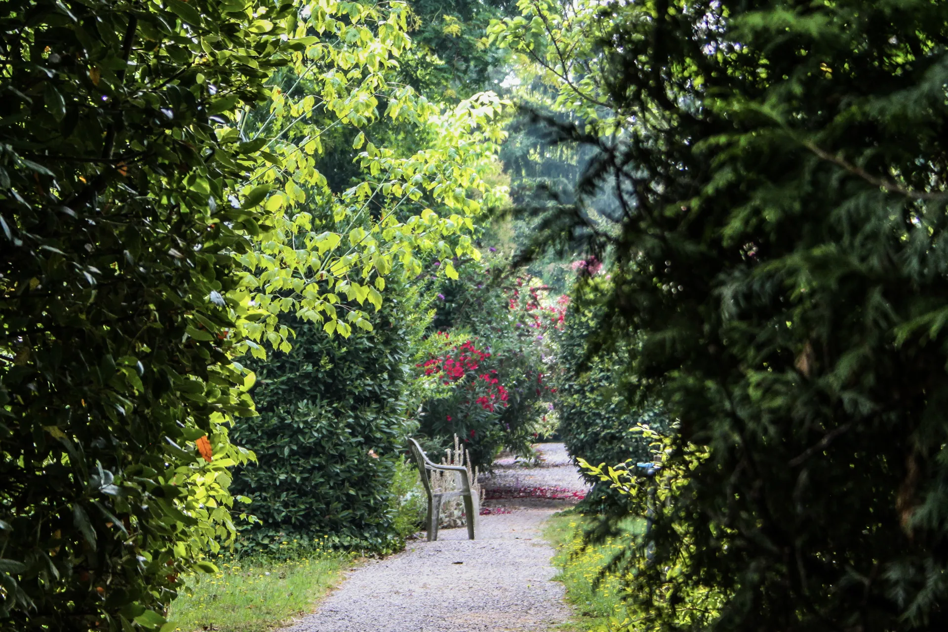 Seguendo i percorsi si attraversano i romantici sentieri bordati di alloro e ciuffi di spirea, fino a incontrare la barriera di alberi che delimita lo spazio aperto di un campetto in cui si potrebbe anche giocare. Qui, alzando la testa, ci si accorge di un enorme pioppo bianco la cui chioma sovrasta il giardino: un gigante discreto, di legno tenero. Si procede tra robinie, tigli, abeti, querce, nespoli ed un fico: questo è un hortus del rango più nobile, dove non mancano neppure le essenze in vaso tenute sulle terrazze. Un acero corallino dalla tinta scarlatta pare voler far notare la sua presenza eccentrica tra le tonalità delicate delle specie tradizionali; questo alberello di gusto moderno vive dirimpetto alla nuova ala del fabbricato, riconoscibile per le grandi finestre, mantenendo un’ottima coerenza d’insieme.