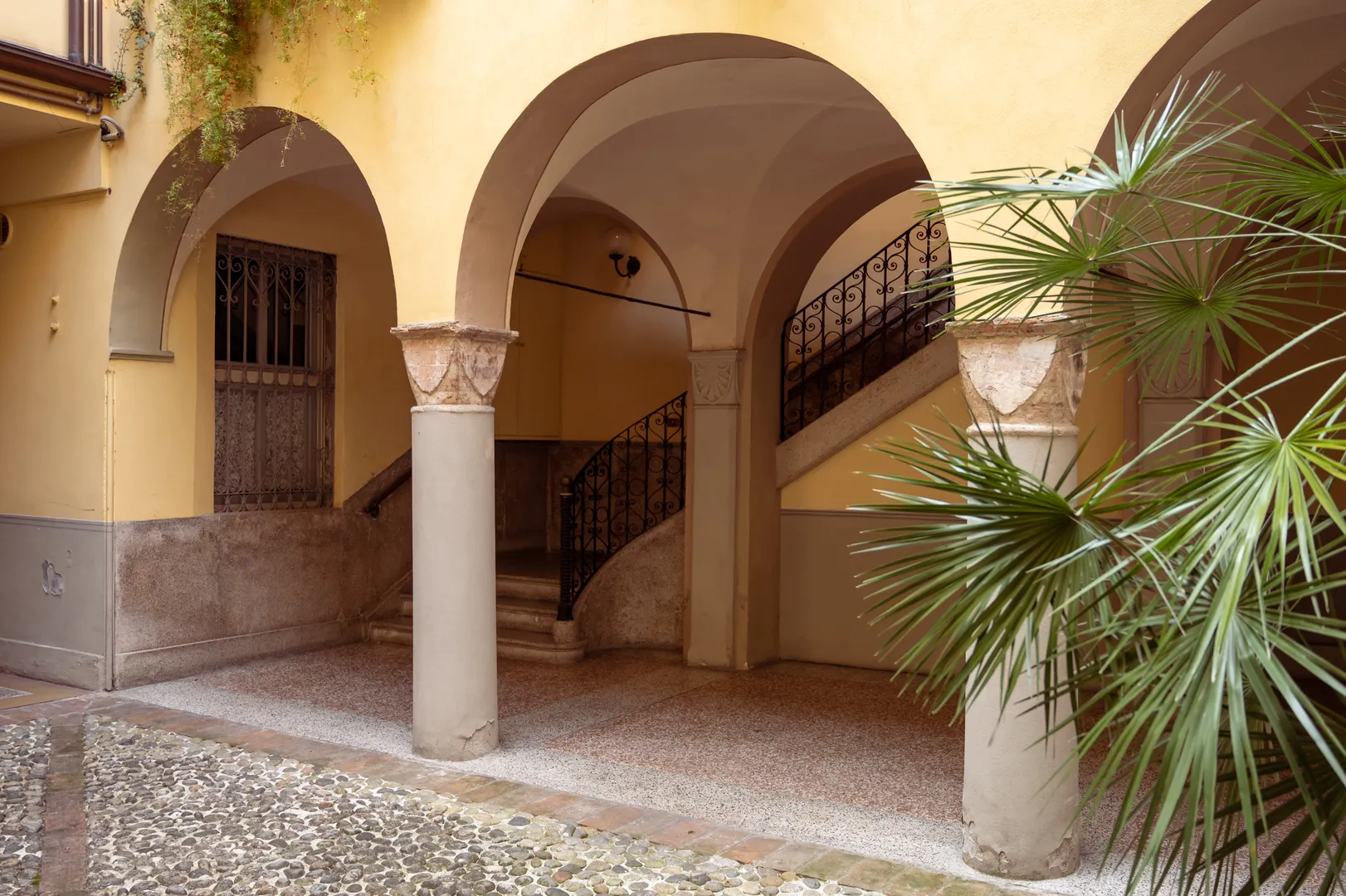 Da notare anche le tracce di antiche aperture gotiche e gli archi a sesto acuto. Il loggiato del primo piano – con i capitelli a calice rivolti verso il cortile, a foglie d’acqua rivolti verso il corridoio – si può supporre che affacciasse in origine anche su un altro scoperto, e che quindi la scala sia stata aggiunta successivamente. Anche la loggia del secondo piano è stata realizzata in un secondo momento: non ha volte ma è ingentilita da due esili colonne corinzie.