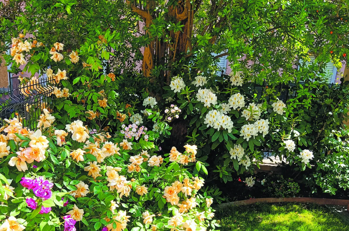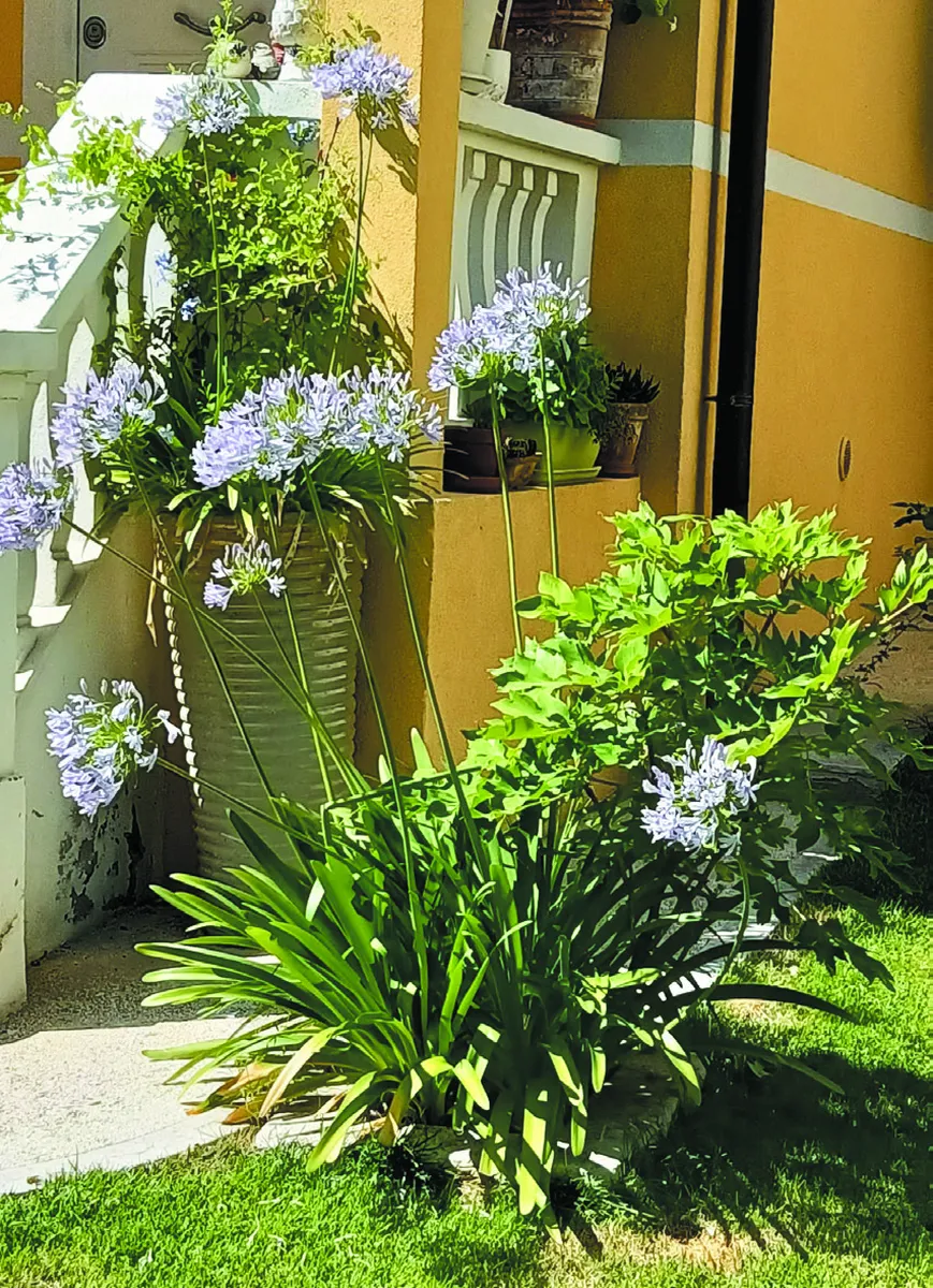 Certo ci vuole passione, ed essere architetto esperto di biofilia aiuta, ma se entrate nel suo cortile troverete in pochi metri quadrati una vera collezione di rose antiche, clematis invadenti, acidofile felici e agapanti azzurrissimi. Tra le macchie di sole e l’ombra degli alberi a cespuglio si affollano ortensie e hoste, oltre a salvie, peonie, crocosmie, gaure e plumbago che arrivano da amici o nonni per questa famiglia numerosa che ama vivere dentro e fuori come fosse tutt’uno.