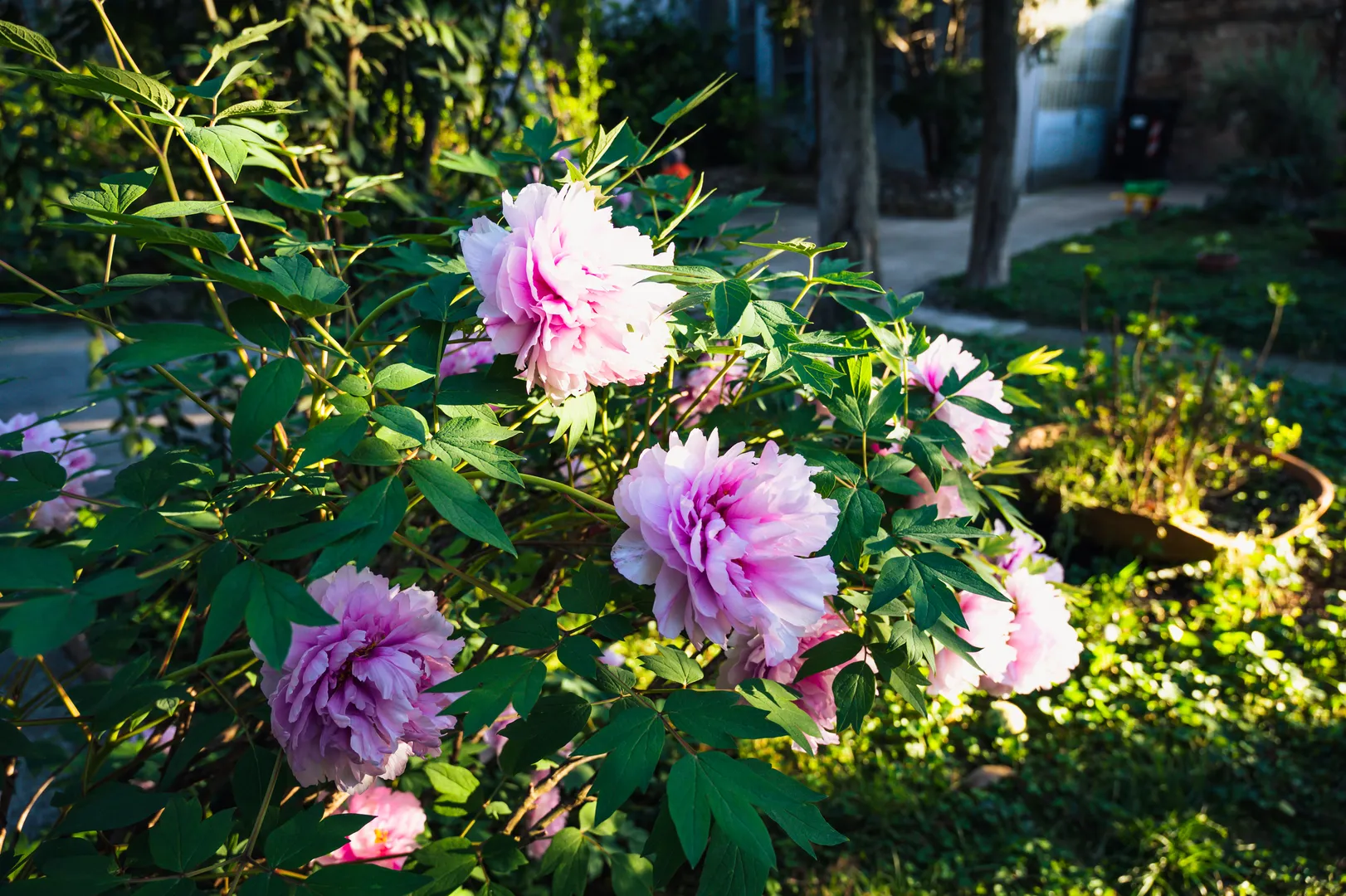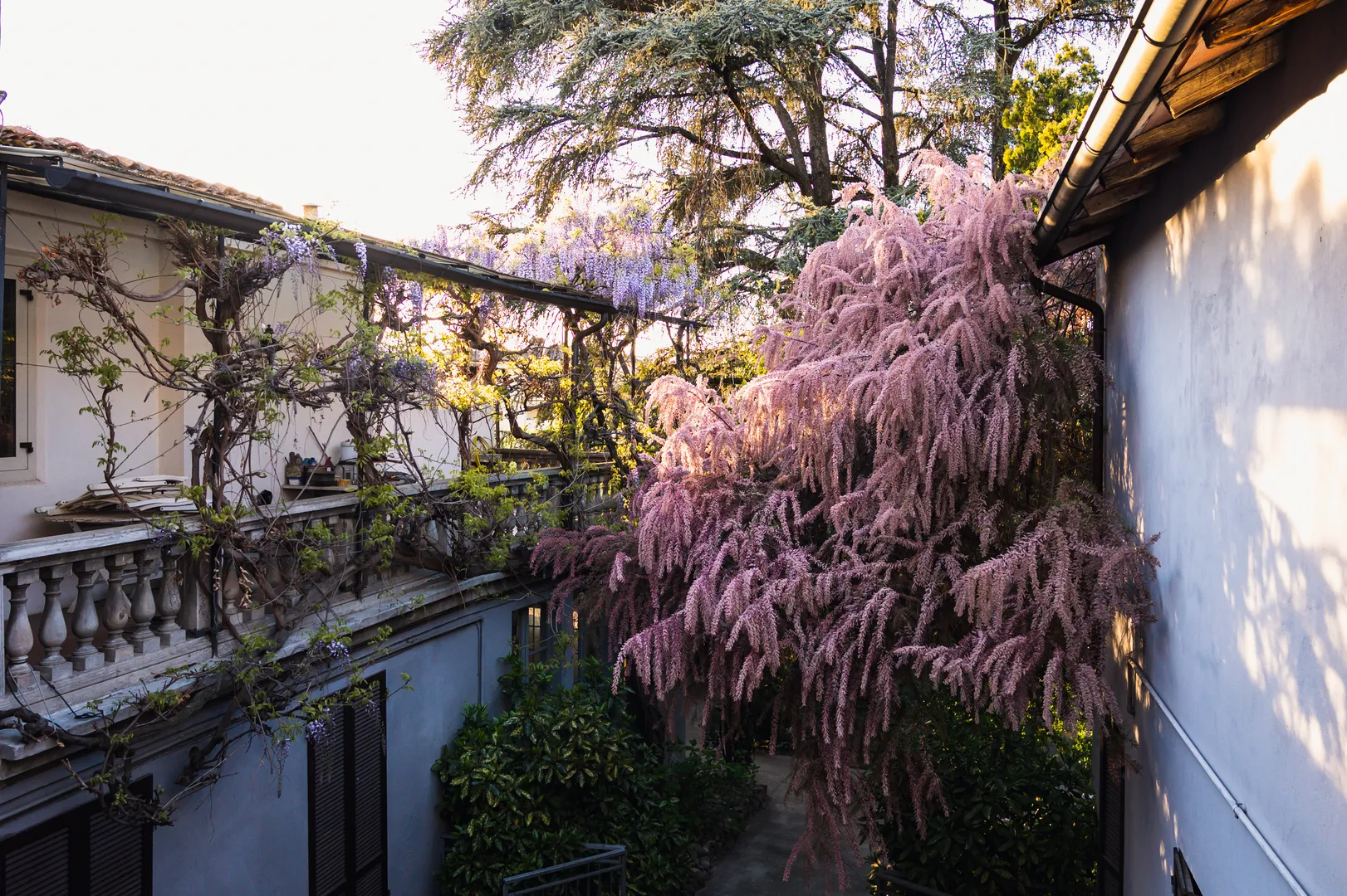 In questo giardino il sentimento della tradizione che affettuosamente si tramanda da padre in figlio è particolarmente vivo. Si legge nei tassi e nei cedri del Libano e nei cipressi piantati dal bisnonno. Squilla nei giochi del nipote, distribuiti tra i cespugli di ortensie, i rosmarini, le rose, le peonie, insieme alle statue di putti e musicisti, che provengono da chissà dove. Ombreggiano l’area verde l’acero giapponese, il tasso, l’abete, il vecchio glicine che si arrampica fino alla terrazza, e la non comune tamerice. Sul muro di cinta, sulla sinistra, si nota uno strano segno: è un triangolo di mattoni, che probabilmente serviva in passato per indicare un confine.