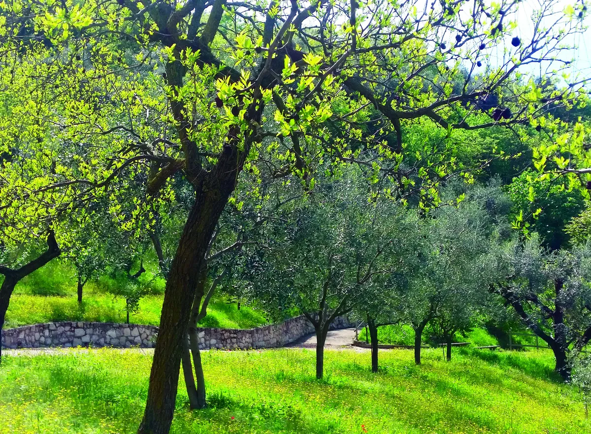 Nel grande spazio ci sono prati alberati e percorsi che portano a piccoli luoghi di meditazione, 160 ulivi, molti giovani alberi da frutta tra cui i fichi della Madonna con la pelle rosa e le prugne Regina Claudia, e alcune viti. L’acqua non è mai mancata e sgorga dal monte, oltre il muro di cinta.