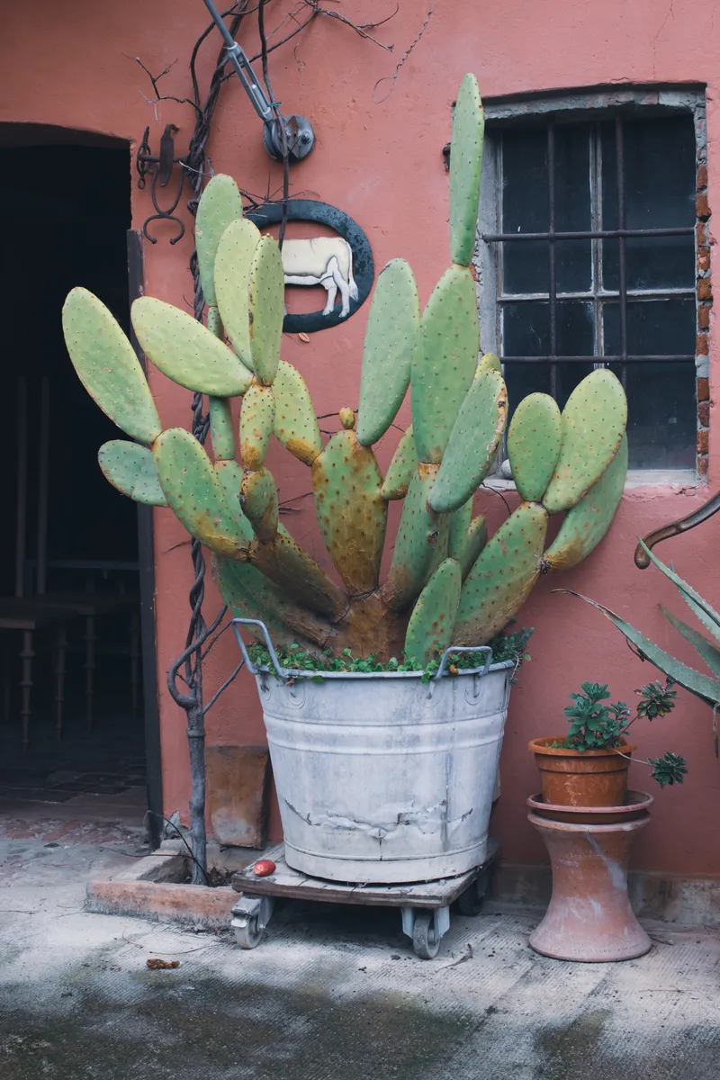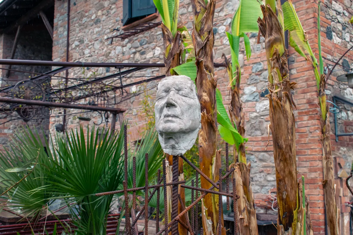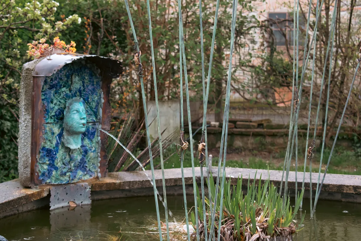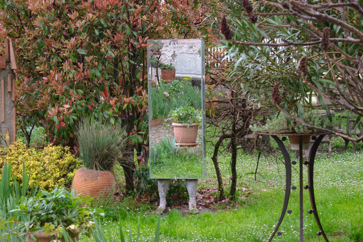 Il giardino che accompagna la residenza è altrettanto ricco di aneddoti, suggestioni, stratificazioni e misteri. La vegetazione esuberante si intreccia alle sculture realizzate con materiali di recupero, tra i fichi d’India e gli oleandri spunta un San Sebastiano, il papiro accompagna la fontana dei pesci, gli specchi giocano tra le tuje e gli ulivi, riflettendo le palme, le rose e le fioriture degli iris.