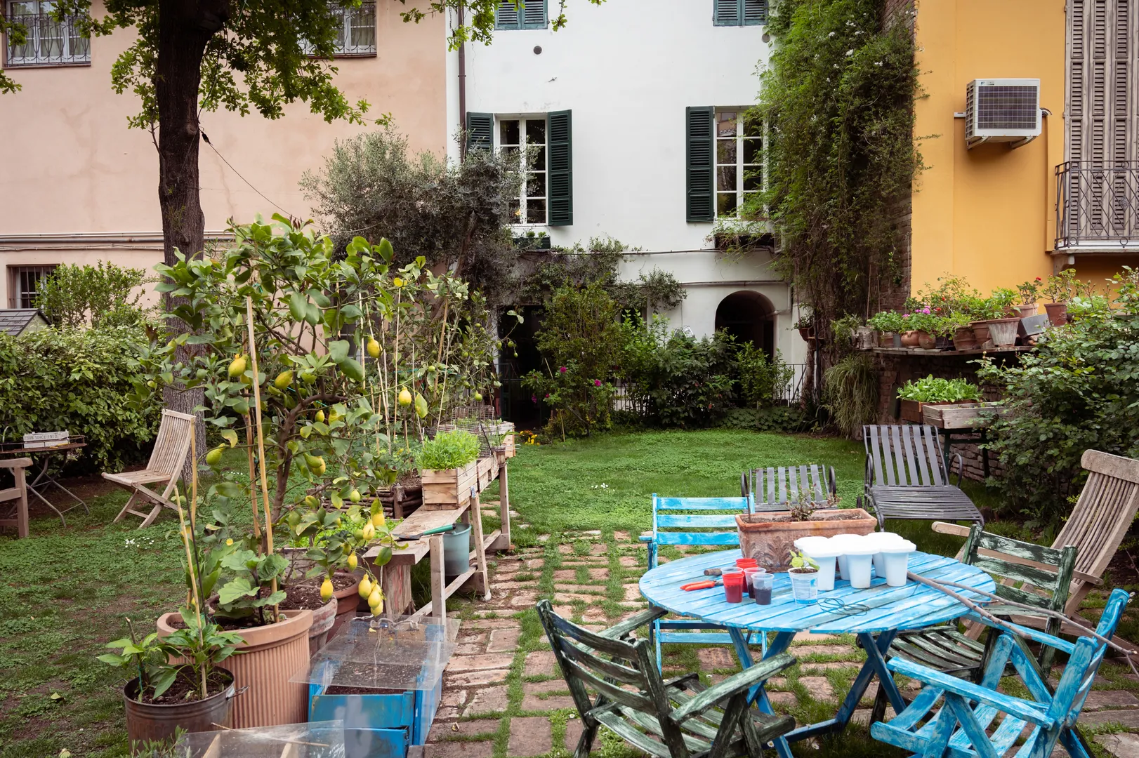L’allegro giardino di Borgo Scacchini 7 sembra essere appartenuto in origine – così come gli appezzamenti vicini – a un distaccamento del Monastero delle Grazie, che ospitava le iniziate alla comunità e una foresteria, come testimoniato dagli angusti dormitori scoperti nel vicino palazzo dei conti Cesarini. Oggi contraddistingue questo spazio la felice commistione di fiori, frutta e verdura.