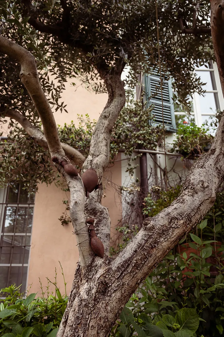 Al centro del prato prosegue questo originale orto diffuso, tra le larghe foglie delle melanzane e i limoni in vaso. In fondo, vicino alla pervinca e alle ortensie, due grandi olmi, l’acero e la quercia. Per riposarsi dalle fatiche dell’agricoltura è stata ricavata, da un vecchio tronco, una piacevole panchina.