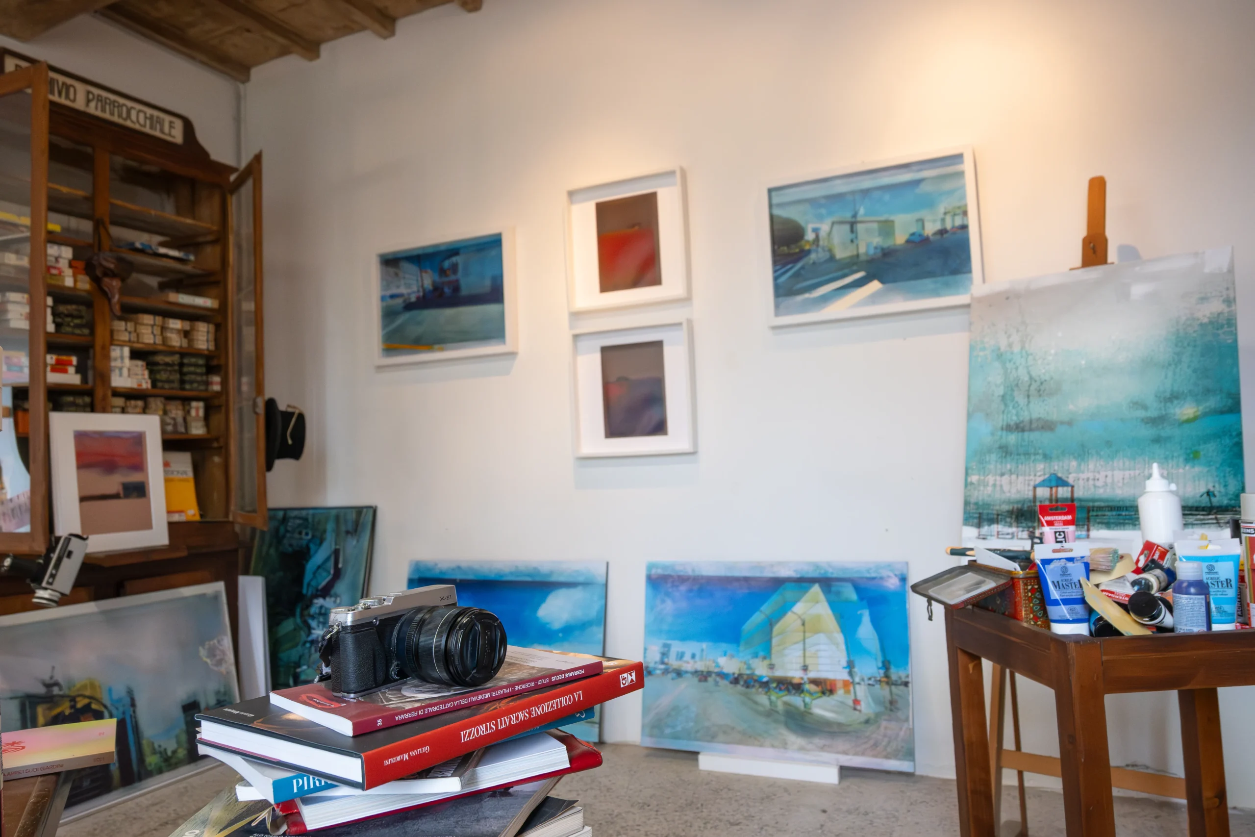 Attraversare questi ambienti richiede una buona concentrazione, oppure del tempo per potersi perdere: l’attenzione si sposta continuamente, richiamata ora dal grande lampadario retrò, ora dai dipinti e dalle opere accatastate, appese ed esposte ovunque. Lo sguardo si appunta sull’acquasantiera kitsch, poi svolazza sulla maschera in cuoio da commedia dell’arte, poi approda ai pesci rossi della tenda da doccia, poi ancora viene catturato dal mobilio retrò e sui nostalgici scaffali dell’archivio parrocchiale. Le librerie sono ingombre: accolgono la biblioteca personale dello storico Daniele Biancardi, appassionato studioso ed esperto conoscitore del territorio, e svariate collezioni di riviste di architettura, degli anni Settanta e Ottanta, come Ottagono: appartenevano a Don Carlo, che viveva qui anni fa.