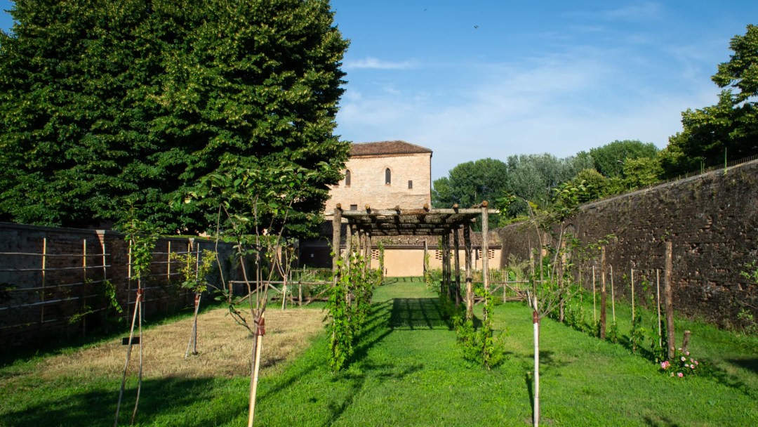 Nella terza parte c’è il pergolato, dove si arrampicano le viti di lambrusco Ruberti, la varietà più antica del territorio, citata anche da Virgilio, e dove di recente sono state piantumate le viti provenienti dal monastero di Weingarten. L’abbazia tedesca è legata a Mantova dalla leggenda di San Longino: parte della reliquia del Preziosissimo Sangue infatti venne presa e portata nella cittadina tedesca dall’imperatore Enrico III.