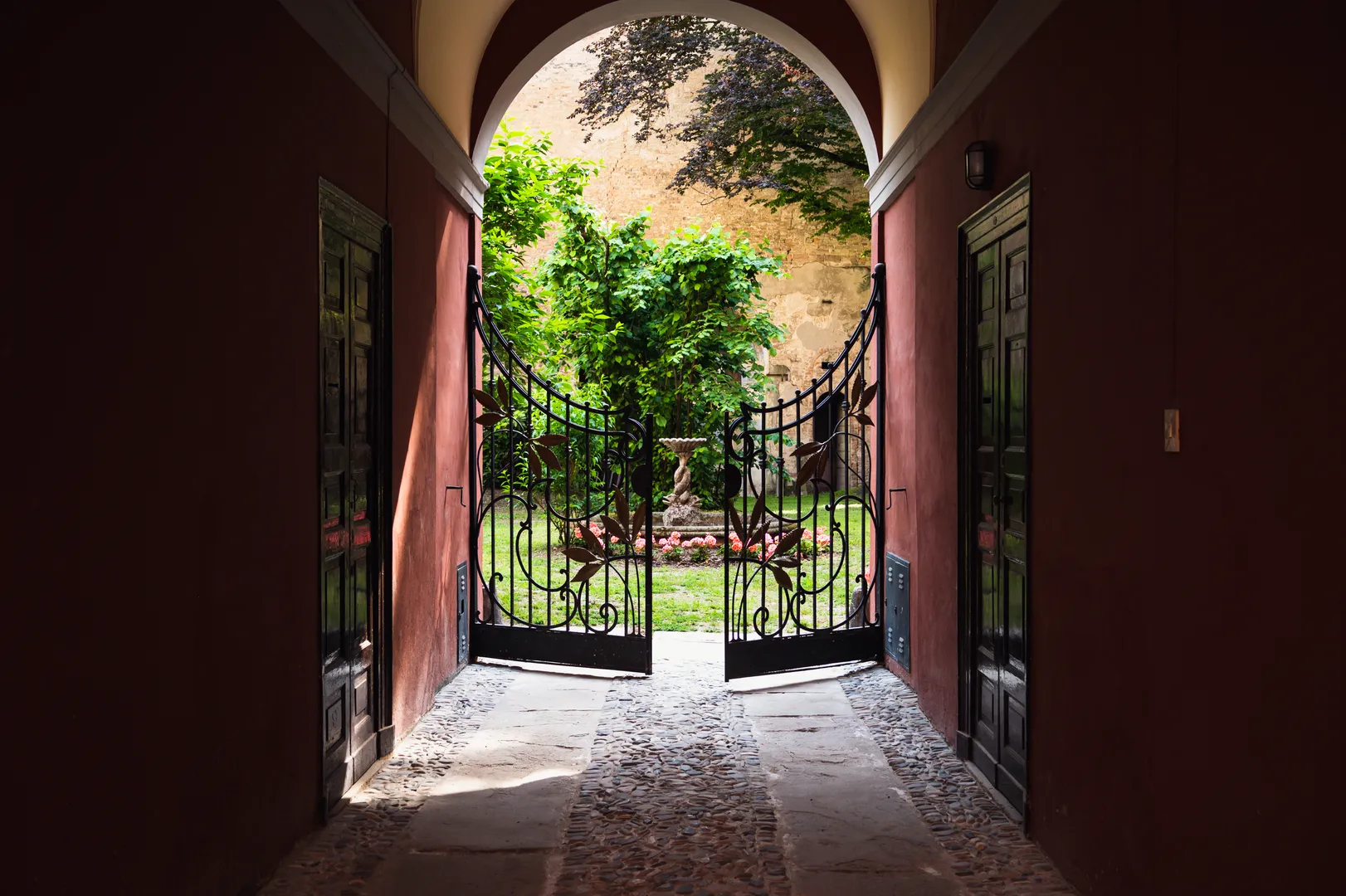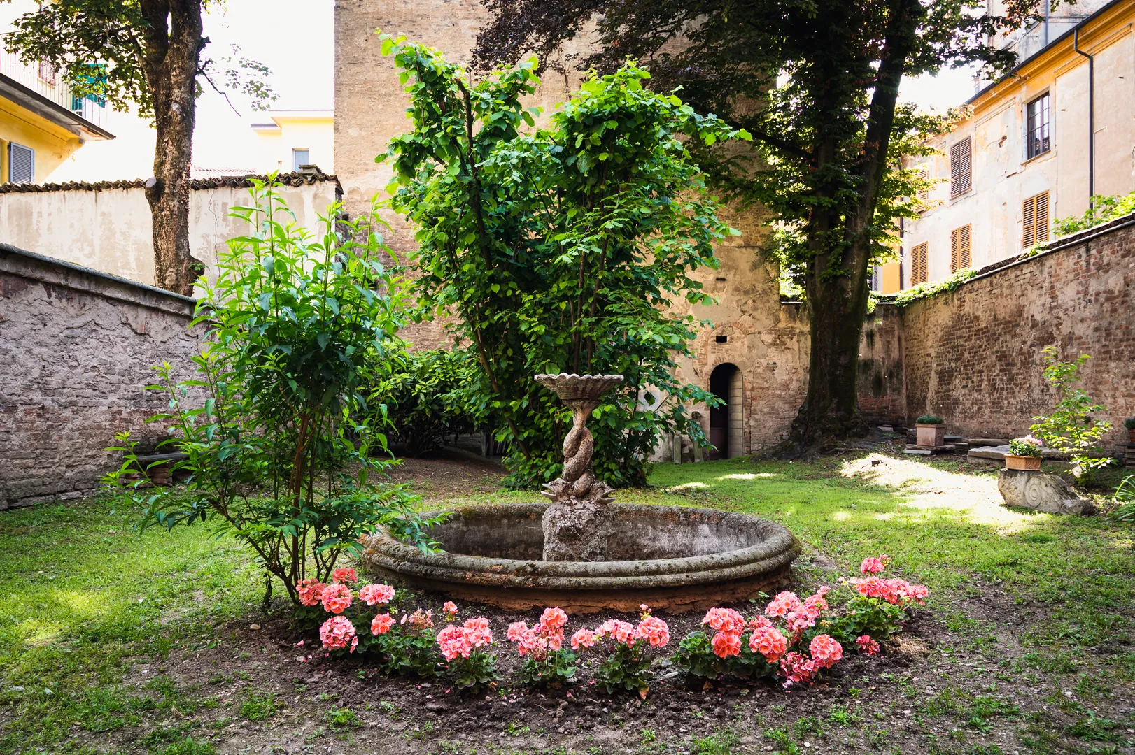 Al centro dell’area, insieme al nocciolo, c’è la fontana con i tritoni attorcigliati dentro alla conchiglia. Nel prato giacciono due mensole di pietra, chiamate familiarmente “le mensole di Garibaldi”. Provengono da un palazzo situato poco distante, nella stessa via, appartenente a dei cugini: sorreggevano il balcone utilizzato dall’eroe dei due mondi per parlare alla città. Vicino ai reperti crescono le ortensie, le rose, le peonie e un piccolo ciliegio giapponese, acquisto recente voluto dalla figlia della proprietaria, che studia lingue orientali. Chiude lo sguardo il vecchio passaggio delle carrozze, decorato con un trompe l’oeil del 1881 che raffigura paesaggi agresti e un’architettura che ricorda quella della casa. Da non perdere infine la porticina: dove conduce? A un’antica stanza da bagno, separata dalla casa, con una grande vasca in marmo e il soffitto affrescato.
