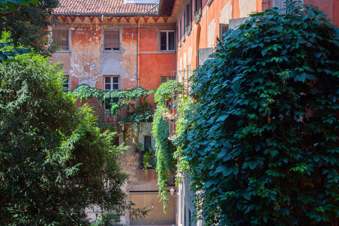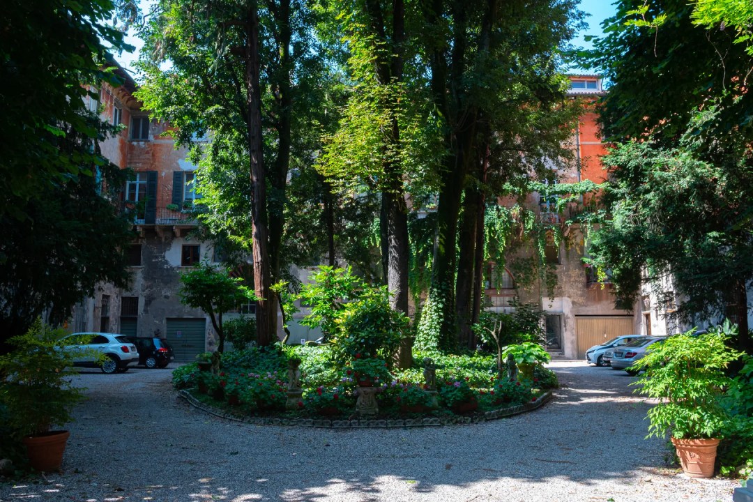 Le necessità della struttura erano evidentemente importanti, così il lotto venne ampliato acquistando anche i rustici vicini. In questo modo si ottenne un ingresso indipendente per le carrozze e un grande spazio dedicato alle scuderie, che determinò un’altra curiosità toponomastica, ovvero la nascita di vicolo Fieno. A progettare il complesso si impegnò l’allora ventenne Giambattista Marconi, che sistemò al piano terra gli ambienti di rappresentanza, al primo piano le camere, disposte attorno al grande giardino quadrato, dotato sulla destra di un forno e provvisto di una capiente ghiacciaia. Il balcone che circonda le stanze, sul quale tuttora si aggroviglia l’anziano glicine, serviva alla servitù per muoversi agilmente tra i vari ambienti senza essere vista nei corridoi. Lʼinaugurazione avvenne il 6 maggio 1785 con un lauto banchetto ma il clima di fiducia nelle “magnifiche sorti e progressive” non durò molto: la Fiera venne dismessa dopo pochi anni e l’attività ricettiva fu sospesa nel 1821. Bonifacio Canossa, nipote di Carlo, cedette il palazzo al governo che vi stabilì la Pretura e il Tribunale. Ulteriori passaggi proprietari e frammentazioni trasformarono il complesso nell’attuale condominio, conosciuto come Palazzo Barbetta, dal nome di una delle famiglie che vi si stabilì nel mezzo della complicata vicenda catastale delle acquisizioni. L’ombroso giardino non ha perso la propria austera eleganza, né la fascinosa atmosfera da Grand Tour.