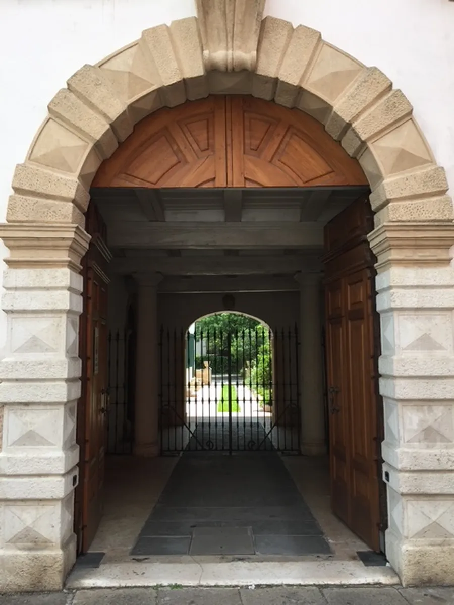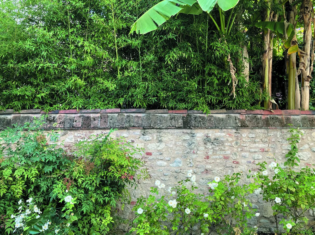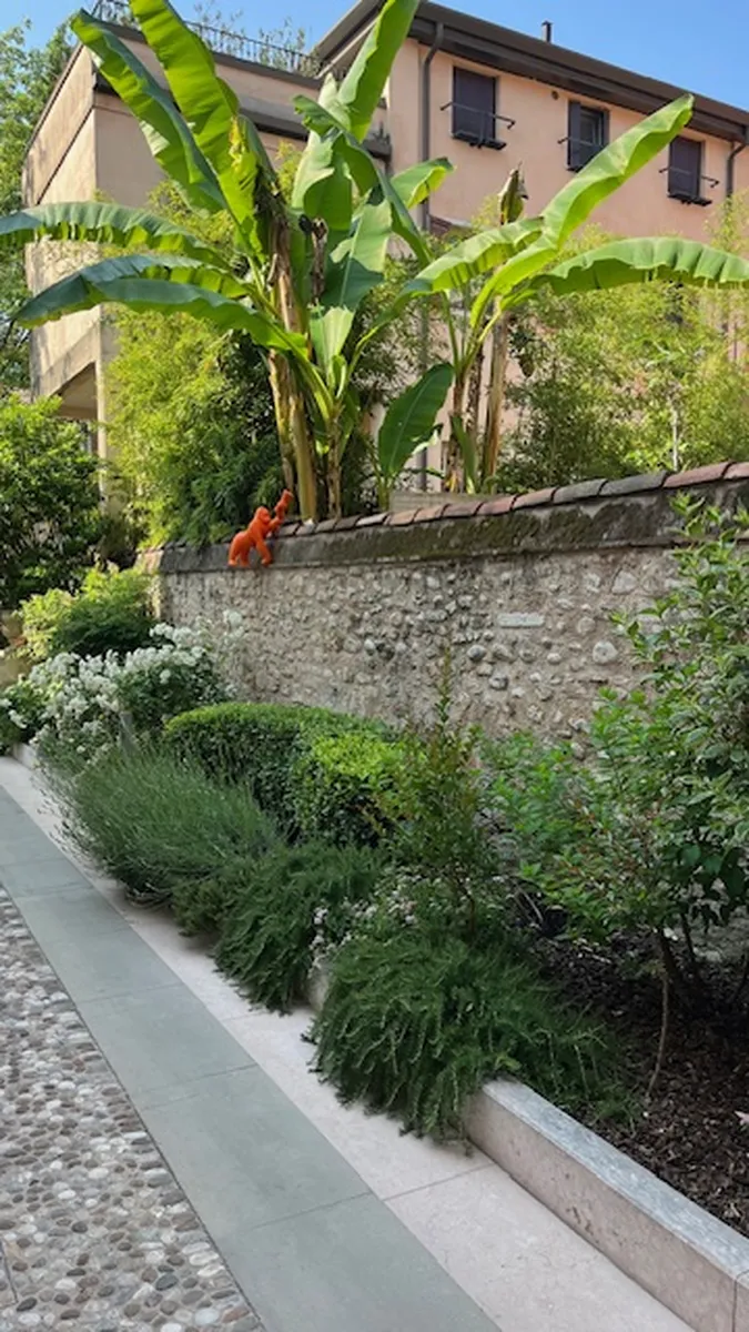 Un lungo percorso conduce dall’atrio all’area verde, anticipata da due colonnine che sostengono vasi di agavi, ricca dì Hydrangea paniculata, Anemone nemorosa, senecio, lavanda, Helichrysum, e rose tutte bianche, sia la ‘Iceberg’ che le tappezzanti, ad eccezione di una vecchia Rosa banksiae gialla. Sullo sfondo, sopra quella che era la casina del gastaldo, si arrampica un gelsomino. Un grande acero saccarino dalla crescita veloce fa ombra sui cespugli di viburno, calicanto e iperico, accanto a un corbezzolo e una Lagerstroemia. Tutto l’insieme può godere anche del verde delle giocose grandi foglie di banano, che sbucano oltre il muro del giardino vicino.