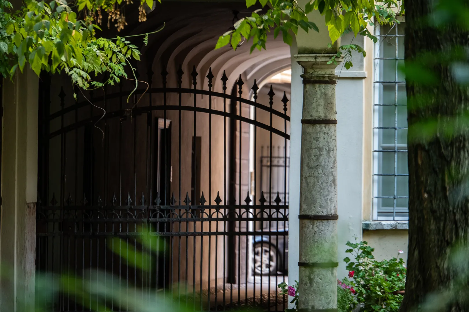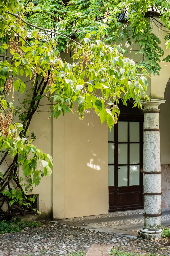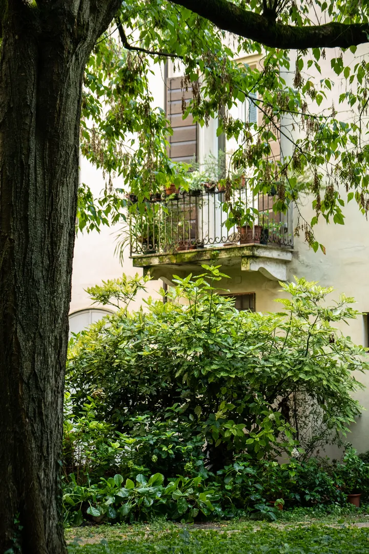 I lavori si conclusero nel 1481 ma nei secoli successivi la famiglia acquistò anche i terreni e le abitazioni vicine, fino ad ottenere l’intero isolato. Al centro del complesso – il cui fulcro era ovviamente rappresentato dal palazzo – non poteva mancare un giardino, ed è così che nasce il tranquillo angolo verde, ombroso e riparato, a cui si accede oggi da via Fratelli Bandiera. L’estensione non è la stessa di allora, è anzi molto ridotta, innanzitutto perché si riferisce a un’abitazione annessa e non alla residenza principale, in seconda battuta perché col passare degli anni le proprietà sono andate nuovamente a frazionarsi e complicarsi. La presenza della loggia interna disegnata dal Fancelli però si legge tuttora ed è verosimile credere che l’architetto – in stretto contatto con Leon Battista Alberti – si sia ispirato proprio alle indicazioni del De re aedificatoria per disegnare questo spazio: «non potranno mancare giardini allietati da splendide piante, e nei giardini un porticato, da cui si può godere sia sole che ombra.