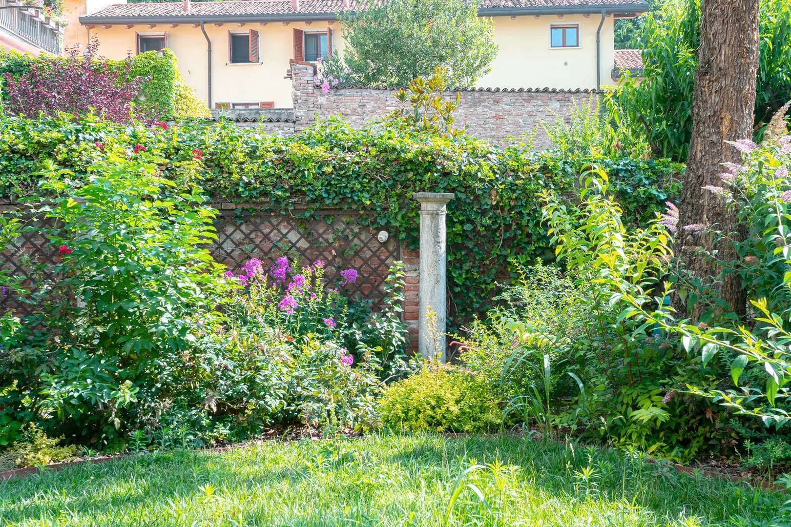 Al giardino si accede superando la tranquilla corte interna. L’area verde, rispetto alle dimensioni del giardino originale, si è rimpicciolita ma conserva un grande fascino, densa di piante, colori e profumi. Il glicine convive con le ortensie, la palma, il lillà e gli oleandri. Il gelsomino incornicia la vecchia colonna di pietra. Tra i fiori vale la pena notare i mughetti, che i proprietari ricordano dall’infanzia, e la rosa antica.