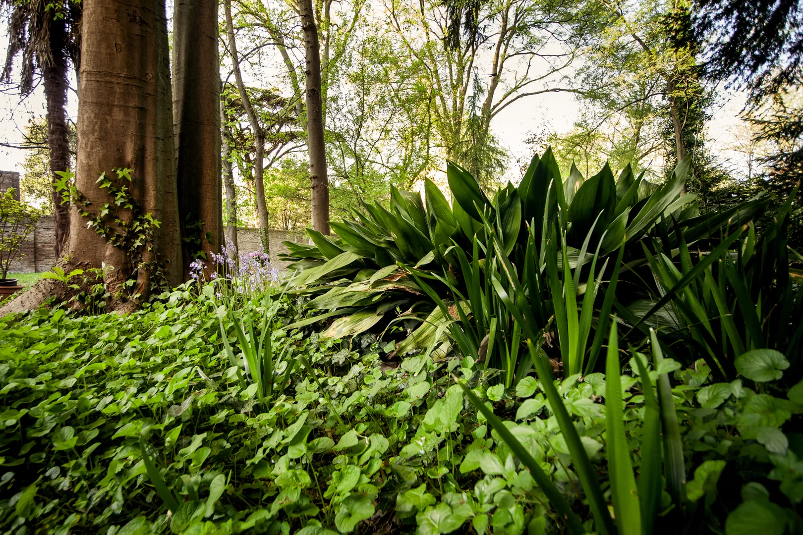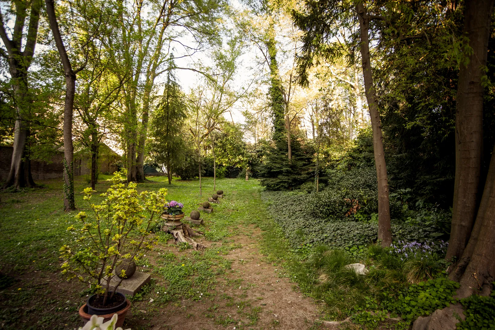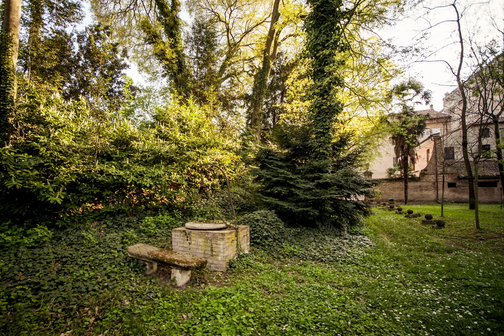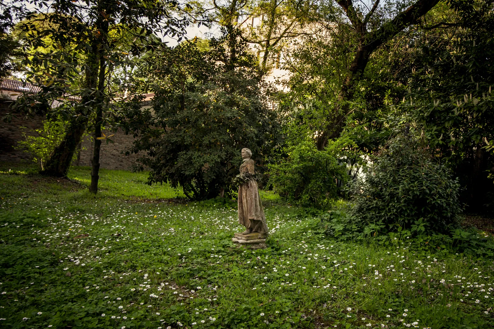 Il boschetto a cui permettere di accedere è di carattere completamente diverso: esplosivo, pervasivo, gioioso, tutt’altro che distaccato. Si inizia l’esplorazione seguendo il percorso, spazioso ma appena tracciato, che accompagna verso l’interno. A sinistra alcuni vasi di fiori e una fila di antiche palle di cannone indicano la direzione, attorniati da varie specie arboree: la palma, l’acero platanoide, l’acero negundo, l’ippocastano. A destra il terreno cresce a formare una piccola collinetta, sotto la quale una volta si trovava la ghiacciaia. Il tappeto di edera e gli arbusti che circondano il vecchio bagolaro, le cui radici si infilano sotto al vicino muro di cinta, sono la dimora abituale di Gelsomina, tartaruga di terra che da 89 anni vive lì. Accompagnano il maestoso esemplare i tassi, le magnolie, il gingko biloba centenario. Al centro dell’area, sola e meditativa, si trova la statua di una ragazza, forse una contadina. «Con il terremoto è caduta e si è rovinato il volto, poi un ragazzo che tagliava il prato l’ha urtata e si sono rotte anche le braccia» racconta Teresa, la custode, che per riparare i danni ha addobbato la figura con rami e fiori. In fondo la siepe di lauro ceraso impedisce l’accesso alla seconda porzione del giardino, attualmente in corso di ripristino.