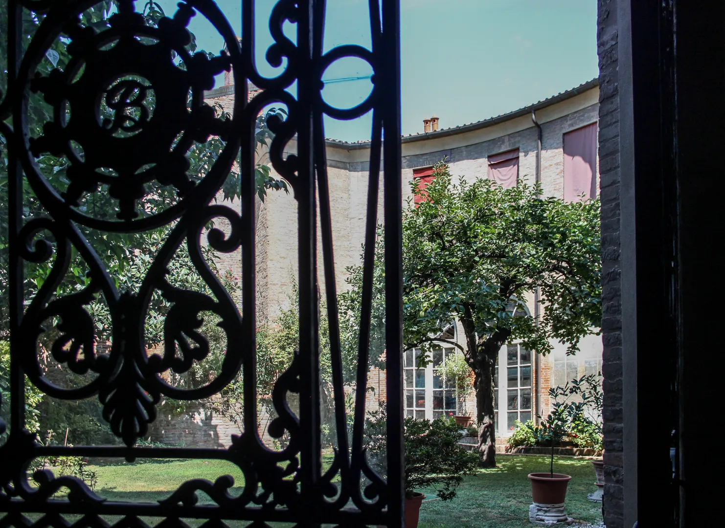 La prospettiva, entrando dal grande portone di pietra bianca, è particolarmente suggestiva. Dall’androne pavimentato in cotto, decorato con affreschi che risalgono al Quattrocento e coperto da un soffitto neoclassico, la vista si apre sull’imponente cancello in ferro battuto, arricciato in volute e spirali, e oltre il cancello incontra il giardino illuminato.
