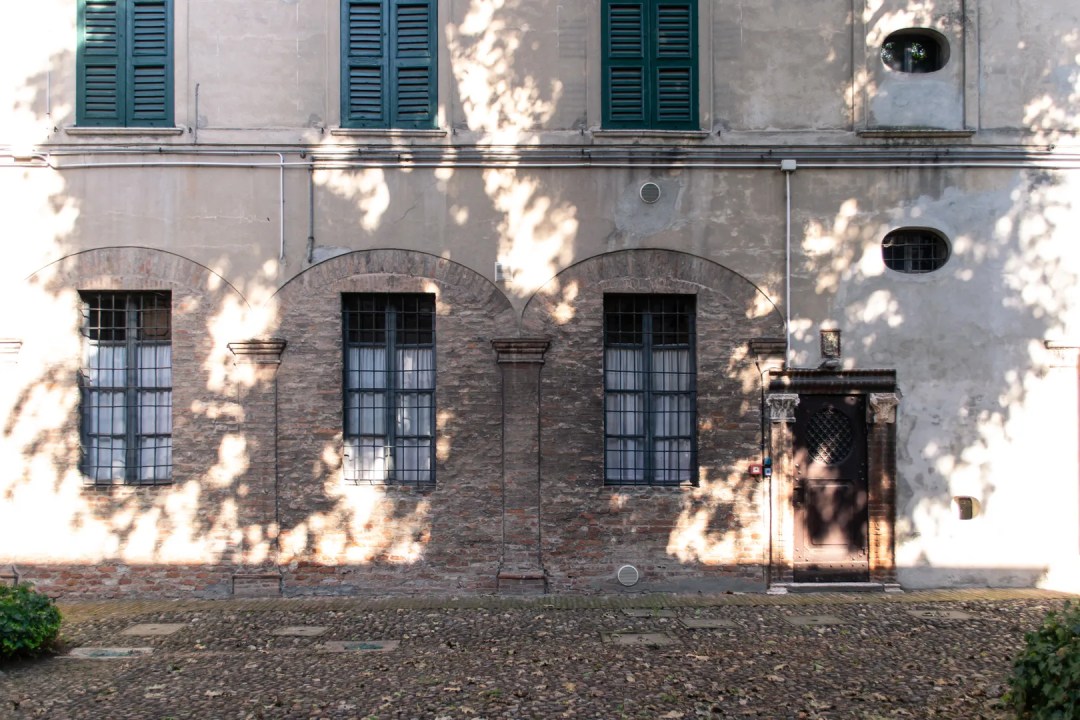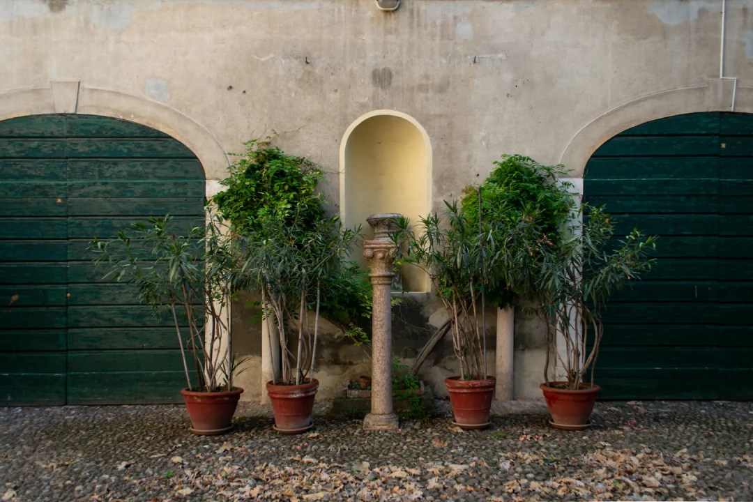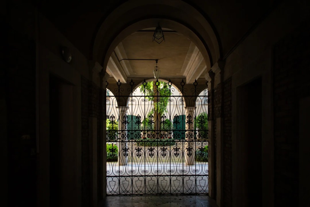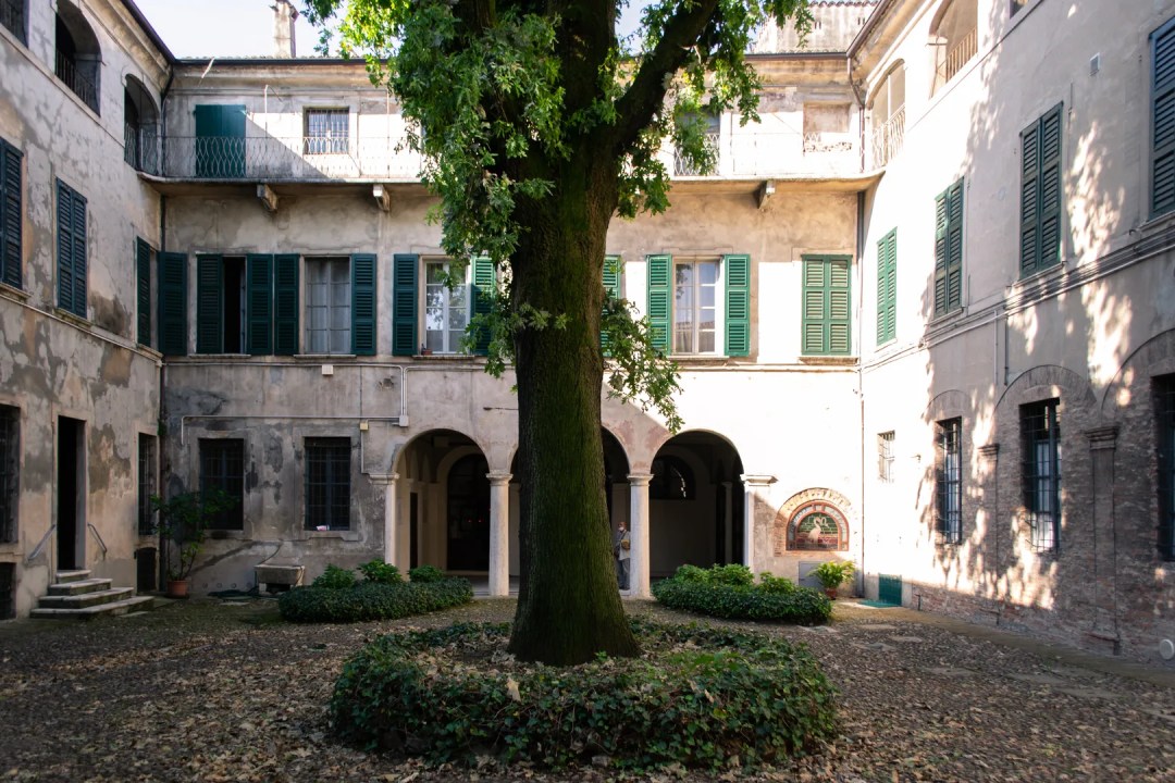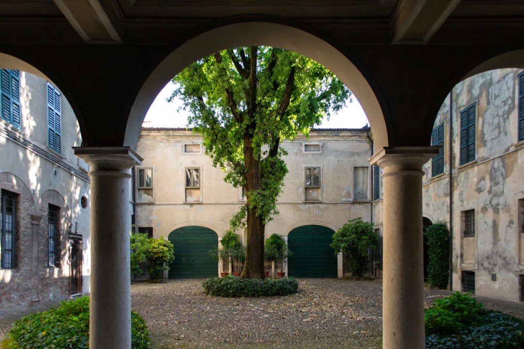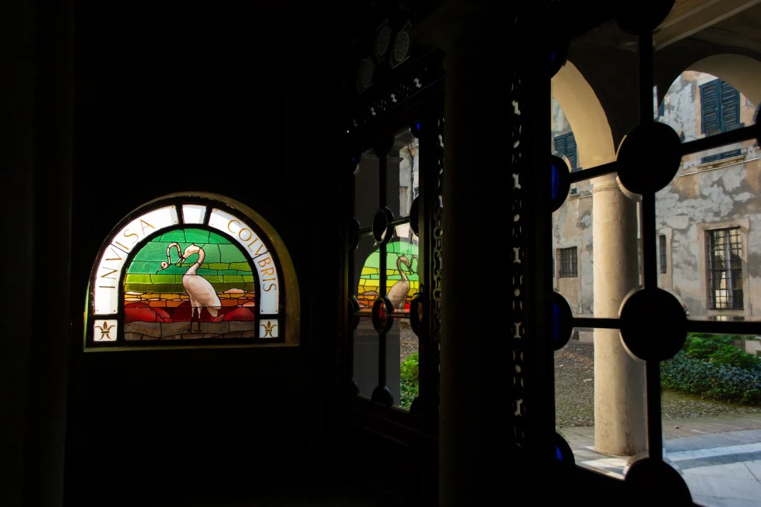 Oggi attraversando il grande androne si entra in un luogo silenzioso e fermo nel tempo. A sinistra scintillano le vetrate colorate che conducono alla splendida scala in marmo, riproduzione in piccolo di quella realizzata da Michelangelo nella Biblioteca Laurenziana di Firenze. Qui si scorge il simbolo della cicogna che tiene nel becco il serpente, simbolo della casata, che si può ritrovare – prestando la dovuta attenzione – anche all’esterno della struttura, nella colonna in pietra abbellita con foglie d’acanto, posta sotto il balcone. Anche la citazione virgiliana che accompagna lo stemma è la stessa: invisa colubris, nemica dei serpenti, dalle Georgiche. Il cortile è dominato dalla grande quercia, che si dice sia anziana quanto la casa. Ai suoi lati stanno le aiuole con le ortensie. In fondo i glicini, gli oleandri e il lauro ceraso. Da notare, vicino al gelsomino, il vecchio passaggio delle carrozze e in alto il sottotetto porticato, riservato agli alloggi della servitù. I domestici entravano dalla porticina collocata a sinistra e salivano le scale fino in cima, attraverso la scala illuminata dalle tre finestrelle ovoidali.