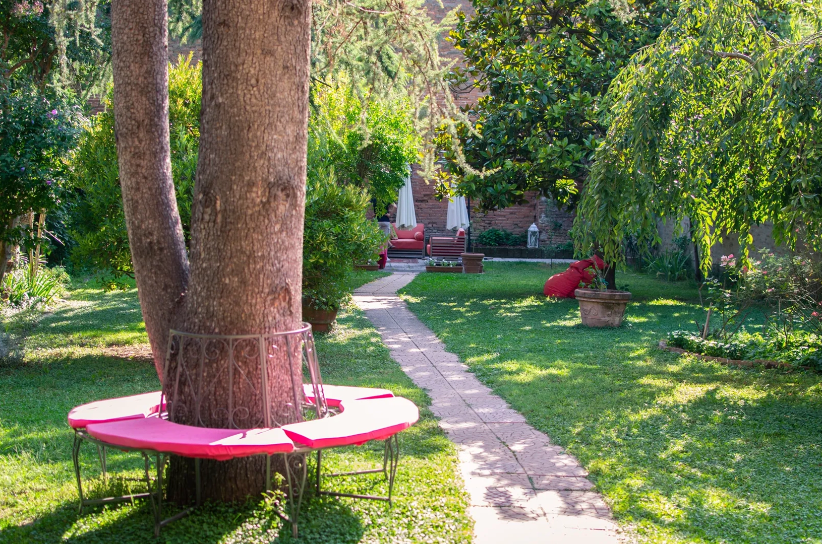 Oggi oasi familiare di pace e tranquillità, una volta questo giardino apparteneva alle coltivazioni del vicino Monastero di clausura di Sant’Antonio in Polesine, il cui campanile si vede svettare oltre il muro di cinta.