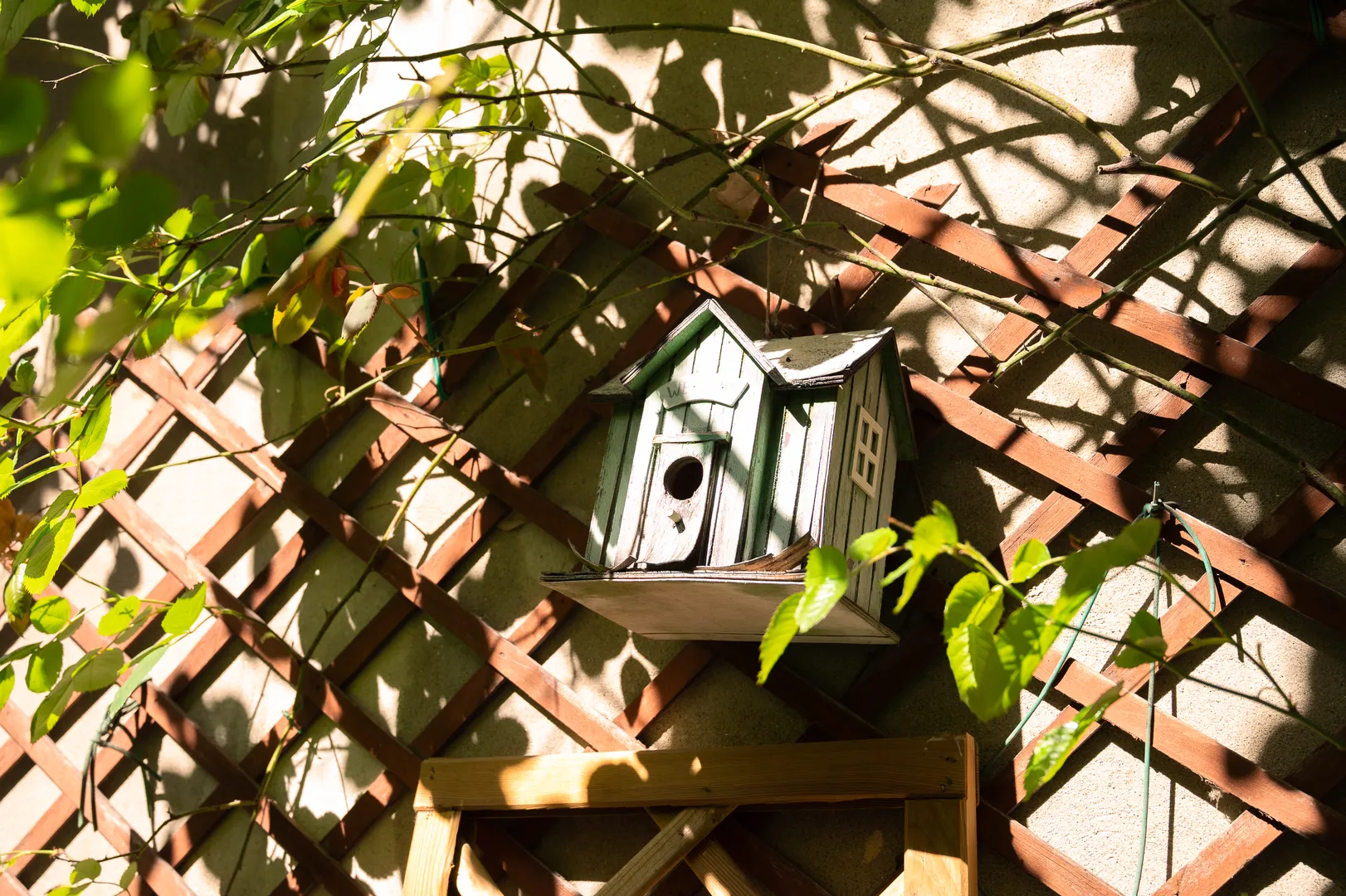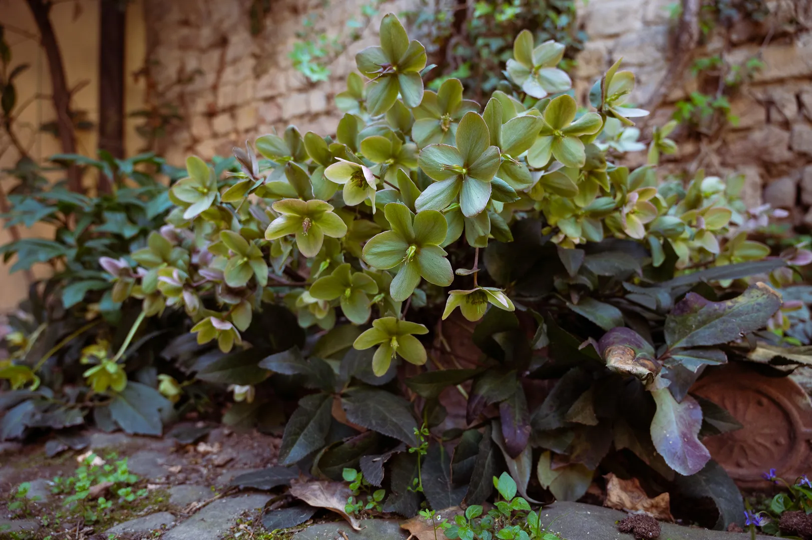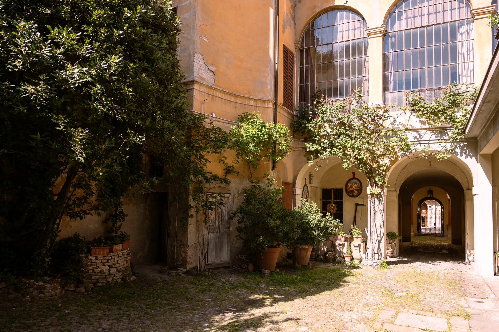 Superato il primo corridoio – dove si possono notare le decorazioni a foglie d’acanto degli archi – si accede al cortile ingentilito dal verde. Oltre al limone in vaso, sulla sinistra si possono osservare l’edera, il tasso, diverse rose, le ortensie e l’aucuba, mentre sulla destra un’aiuola di elleboro è in compagnia del calicanto, dell’alloro, della maonia e del pitosforo. Nella bordura crescono alcuni ciclamini di Sospirolo, nel bellunese, paese di provenienza della famiglia Miari. Sempre sulla destra, sotto la zona porticata, il sambotto che serviva ad annaffiare le piante e alcuni simpatici medaglioni, acquistati a Natale, che riproducono i dipinti realizzati dal Correggio per la Camera della Badessa a San Paolo. Decoravano l’albero allestito in piazza Garibaldi dal Comune; concluse le festività furono acquistati da chi ne faceva richiesta, e il ricavato destinato alla beneficenza. Sopra quest’area coperta si arrampica la rosa gialla, mentre dalla parte opposta, sul balconcino, si allunga un bel glicine