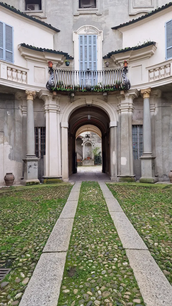 E poi le piante e i fiori ci sono, anche se non c’è il classico prato. Vogliamo davvero discriminare chi cresce in vaso? Palazzo Novati è una gemma da cui non si può non rimanere affascinati, pavimentato di tondi ciottoli di fiume, teatrale come solo l’architettura barocca sa essere. L’edificio ha origini rinascimentali, ma la conformazione settecentesca si deve a Giancarlo Novati, architetto, pittore e sacerdote, la cui memoria si conserva nel nome dell’antica residenza. L’ampia struttura circolare, colonnata, si richiama al “Convito di Baldassarre”, opera del pittore piacentino Giovanni Paolo Panini. Un’altra fonte di ispirazione probabilmente sono stati i progetti del Bibbiena. Ad arricchire questo ambiente già suggestivo intervengono gli arredi contemporanei realizzati dall’artista Franca Franchi, pezzi unici filiformi ed eleganti, creati con metalli recuperati.