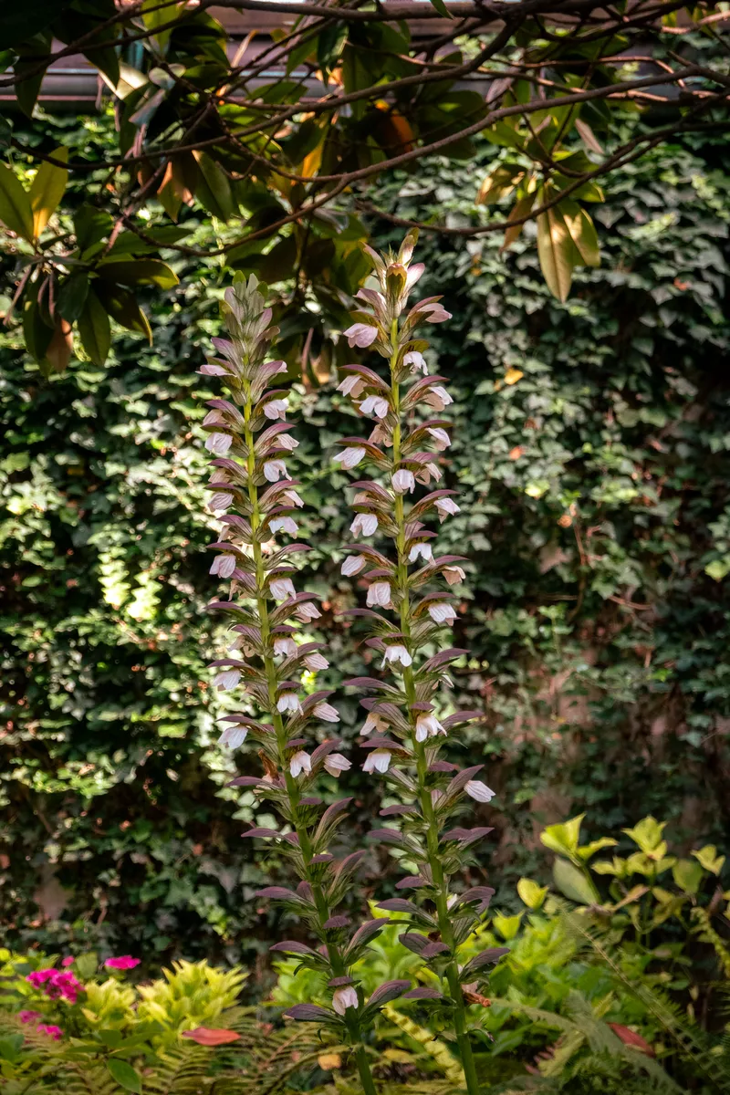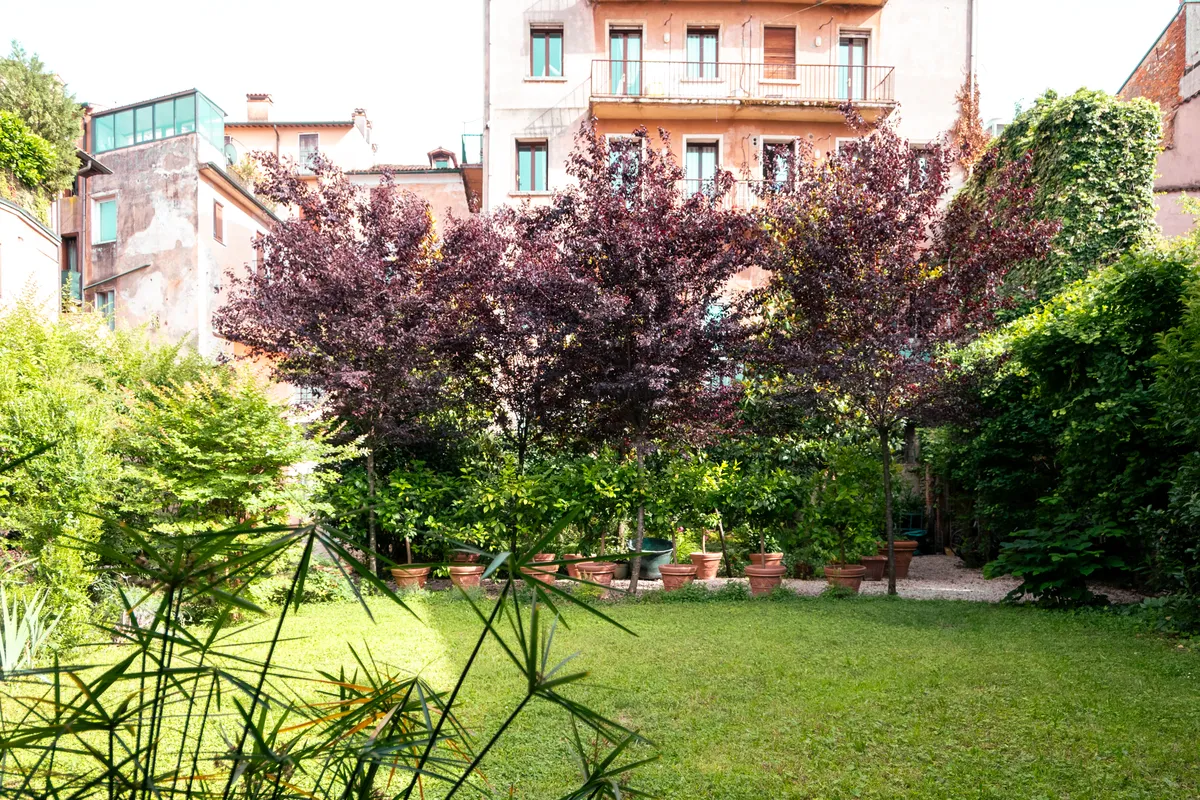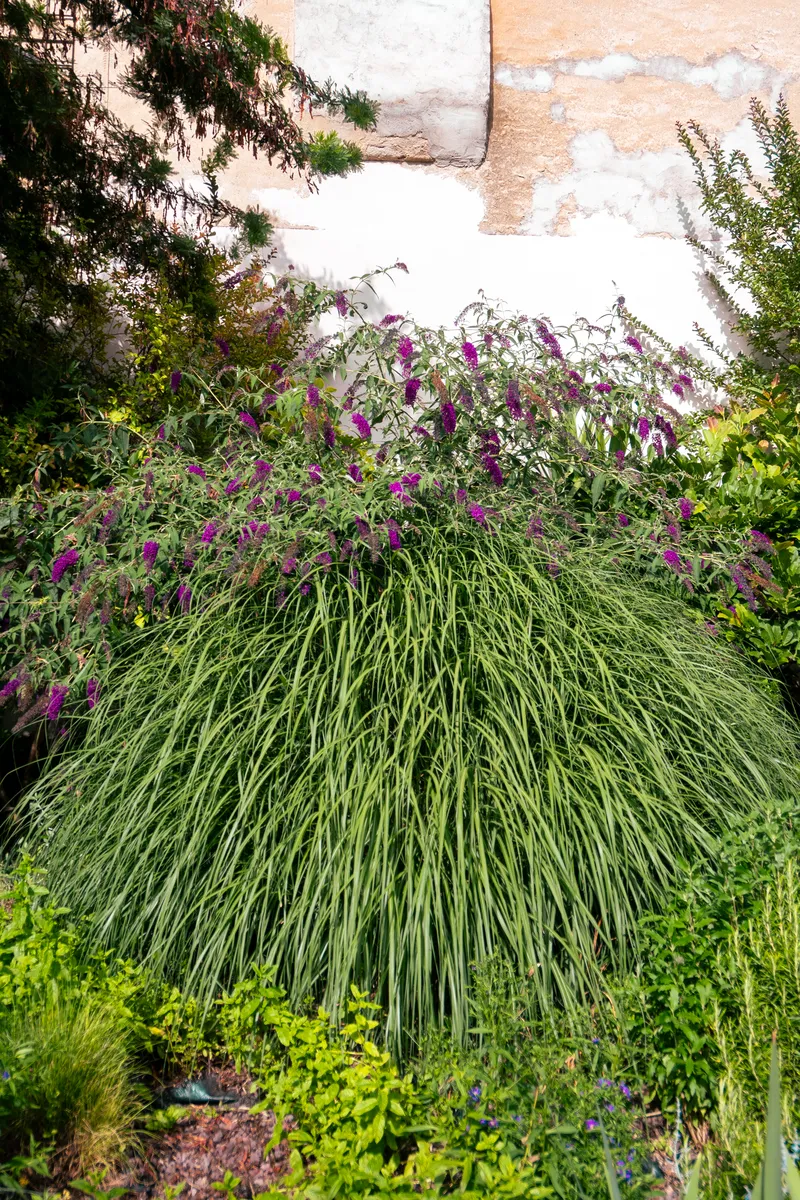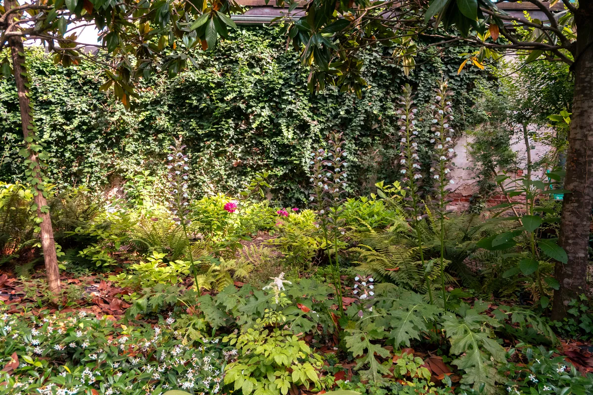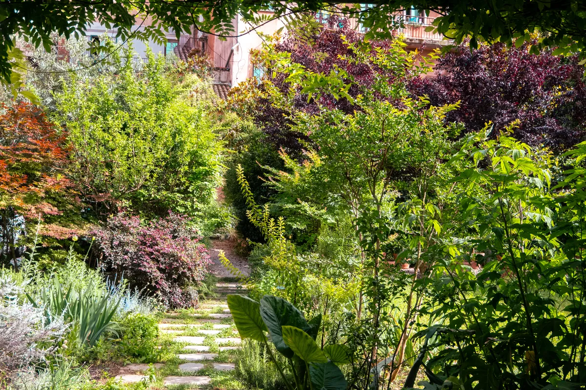 Il prato non si pettina all’inglese, si preferiscono sfalci differenziati per lasciare tranquilli gli insetti e favorire la biodiversità. Nelle zone più ombrose non si forza il terreno a ospitare ciò che non può e si sperimentano soluzioni innovative, come il curioso tappezzamento di gelsomino rustico, lasciato espandersi orizzontalmente. L’insieme è romantico e decisamente affascinante, volumi e colori si mescolano, le aromatiche spandono il loro profumo nell’aria e le farfalle svolazzano dalla buddleia alla mimosa, dalla mimosa al pruno rosso. Il chiacchiericcio di corso Fogazzaro sembra lontanissimo: si ascoltano le cicale, i grilli, gli uccellini. Ci si dimentica del mondo per osservare come crescono le felci, gli acanto, le ortensie, i loropetalum, per fermarsi ad ammirare le peonie, i settembrini, le salvie, gli elicriso.