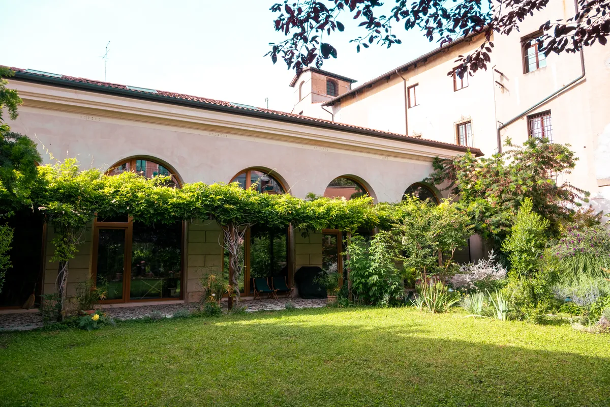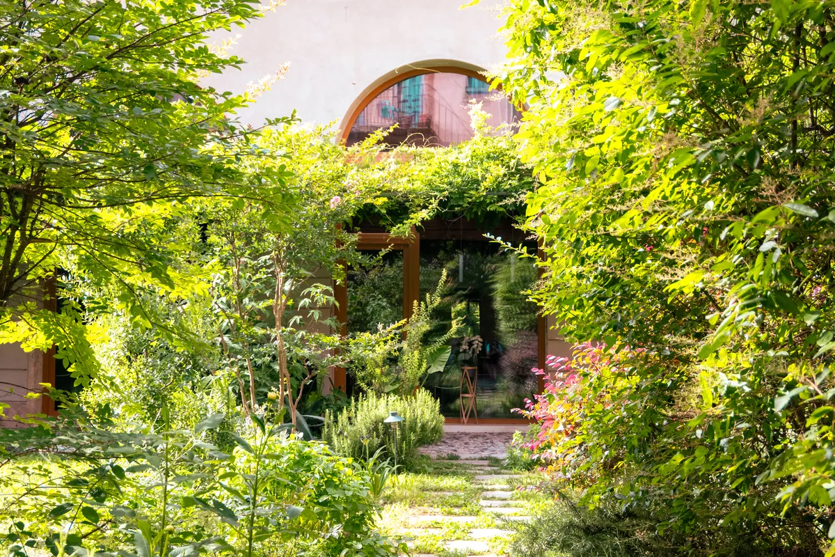 Il giardino si inserisce al termine di questo lungo percorso: è stato creato nel 2020, in piena pandemia Covid, per affiancarsi come spazio privato all’abitazione ricavata dentro le vecchie stalle. A camminarci dentro sembra esista da sempre: gli alberi sono grandi, la vegetazione fitta, in realtà è giovanissimo. Francesca, che l’ha ideato e pazientemente lo cura, ha cercato qui di far convergere istanze diverse: certo c’è la ricerca estetica, il gusto di chi ama circondarsi di bellezza, ma c’è anche la praticità di chi vuole vivere il giardino e non solo osservarlo da lontano, e c’è la sensibilità per l’ambiente, che spinge verso scelte ecologiche.