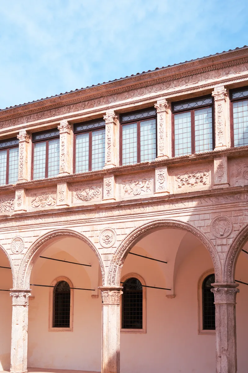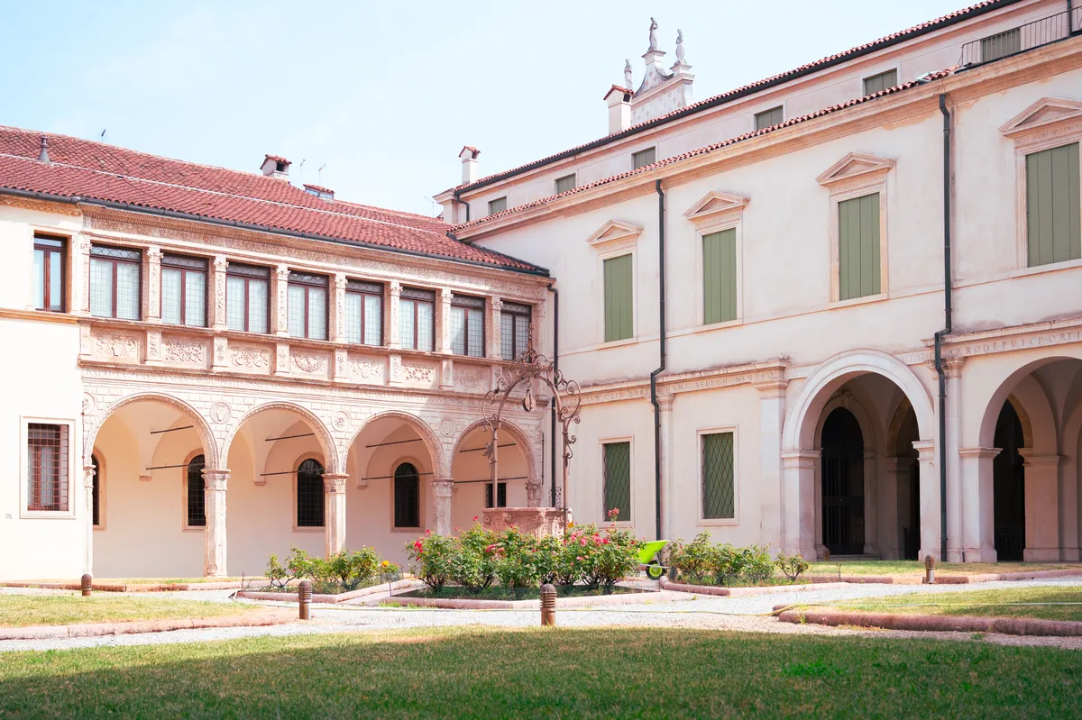 Cosa incontra oggi chi supera il pesante portone affacciato in piazza Duomo? Un grande cortile arioso. Sulla destra spicca la loggia rinascimentale voluta dal vescovo Giambattista Zeno, il cui stemma si ripete sopra i pennacchi delle volte. Il progetto di gusto lombardesco viene attribuito a Bernardino da Como, la realizzazione al muraro Giovanni Fugier e ai suoi figli. La vera da pozzo al centro dell’area è coeva alla loggia: entrambe risalgono alla fine del Quattrocento. Il portico parallelo, quello a destra dell’ingresso, è appena successivo: venne realizzato nel Cinquecento per volere del cardinale Niccolò Ridolfi, su disegno di Giambattista da Brescia.