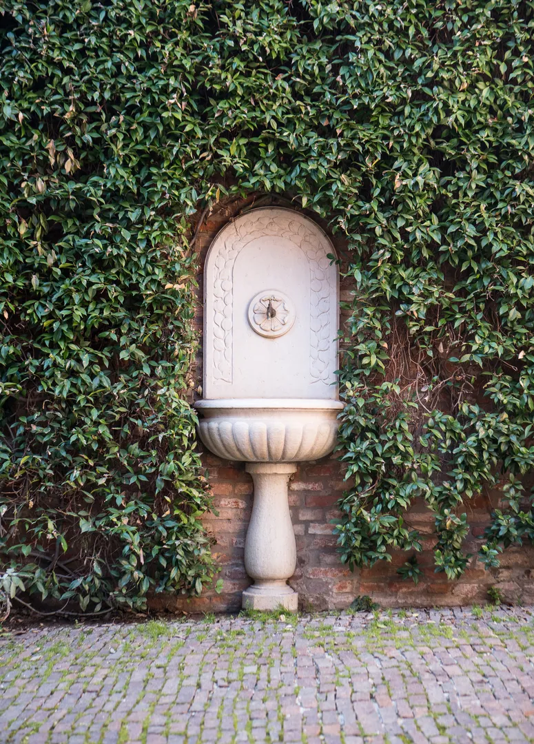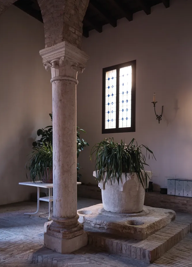 «Ci sono anche tantissimi putti e amorini dipinti, li abbiamo trovati dappertutto». L’ambiente – illuminato dai raggi del sole che provengono dal giardino, filtrati dalle vetrate blu e arancio del portone in ferro battuto – è profondamente solenne, induce alla contemplazione e al silenzio, eppure le storie che racconta sono tante. Il porticato è solo una porzione dell’originale, l’altra metà dovrebbe proseguire in quella che oggi è l’abitazione dei vicini. Il pozzo vicino alle colonne marmoree è asciutto, mancava anche la struttura: quella che si vede oggi è stata comprata in Veneto. Un altro pozzo, dal carattere decisamente originale, è stato scoperto a due passi dall’androne, quando si rese necessario scavare la buca per l’ascensore: si tratta di un pozzo da butto, fondamentalmente una discarica casalinga. «Gli operai non volevano avvicinarsi e non volevano nemmeno che io mi ci avvicinassi, almeno in orario di lavoro. Allora quando finivano la giornata mi calavo là dentro da sola, tutta imbragata come se dovessi scalare una montagna. Mi teneva appesa una corda legata in cima a una trave. Sono riuscita a scavare fino a sei metri e mezzo di profondità, ho smesso quando ho cominciato a trovare solo sabbia fine. Ho recuperato di tutto! Cocci di ceramica ferrarese che ho incollato un pezzo alla volta, col Vinavil, ma anche una mandibola di cavallo e tantissimi femori di aironi, che in epoca rinascimentale erano particolarmente apprezzati a tavola. Dopo pochissimo tempo i tombaroli iniziarono ad aspettarmi fuori casa, perché la voce di quello che stavo trovando girava in fretta. Insistevano perché gli lasciassi vendere alcuni pezzi, con la promessa di dividere i profitti, ma non mi sono mai fidata!». Gli anni del recupero furono anni di esplorazioni, accompagnati da piccole e grandi scoperte: «ci rendemmo conto che sotto le cantine non c’erano le fondamenta. Probabilmente quando furono costruite il Po correva ancora dove ora si trova la strada, quindi affacciavano direttamente sull’acqua». Dove oggi si trova il garage invece c’erano le scuderie, e alle pareti ancora si vedono gli anelli utilizzati per allacciare le redini dei cavalli. Al posto delle carrozze oggi in giardino si trovano alberi, arbusti e tantissimi fiori, ciascuno con una propria memoria. Gli oleandri, per esempio, vengono dalla Sardegna: «avevo staccato un rametto di un alberello selvatico a Cala Luna, lo tenevo in barca dentro a un bicchiere d’acqua. Lo trasportai fino a Ferrara infilato in una bottiglia di birra e poi lo accomodai prima in un vasetto in cucina, poi in un vaso più grande in terrazza. Continuava a crescere e mise le radici, fino a quando capii che era arrivato il giorno di piantarlo a terra».  Gli agapanti arrivano dal Portogallo – «ho girato mezza Lisbona per trovarli!», mentre la varietà di geranio che colora il balconcino sopra al garage viene da un’isola della Grecia. Lo spazio è protetto, oltre che dal gelsomino selvatico, anche dalla robusta siepe d’alloro e dalla splendida ortensia rampicante, che sale verso le finestre. A terra si incontrano – assieme alle classiche piante aromatiche – crochi e ciclamini, fiori di lillà, violette, calle. Nella vasca cresce l’ortensia quercifolia. Raccolgono il calore estivo il mandarino e il limone. D’inverno fioriscono gli ellebori e il calicanto.
